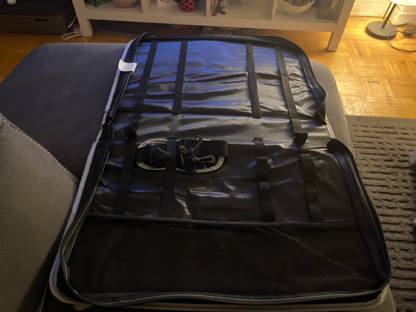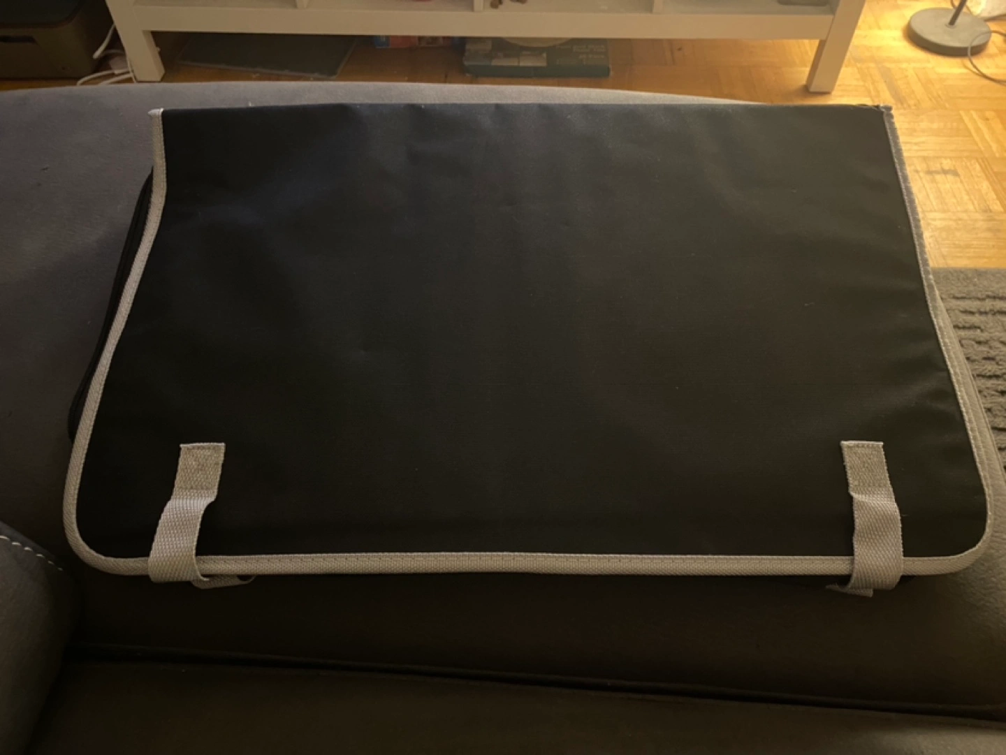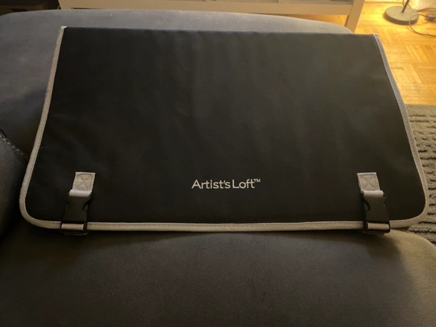 Black canvas carrying case for a sketchbook and art supplies. Has a zipper closure, two straps with buckles, and an interior pockets.