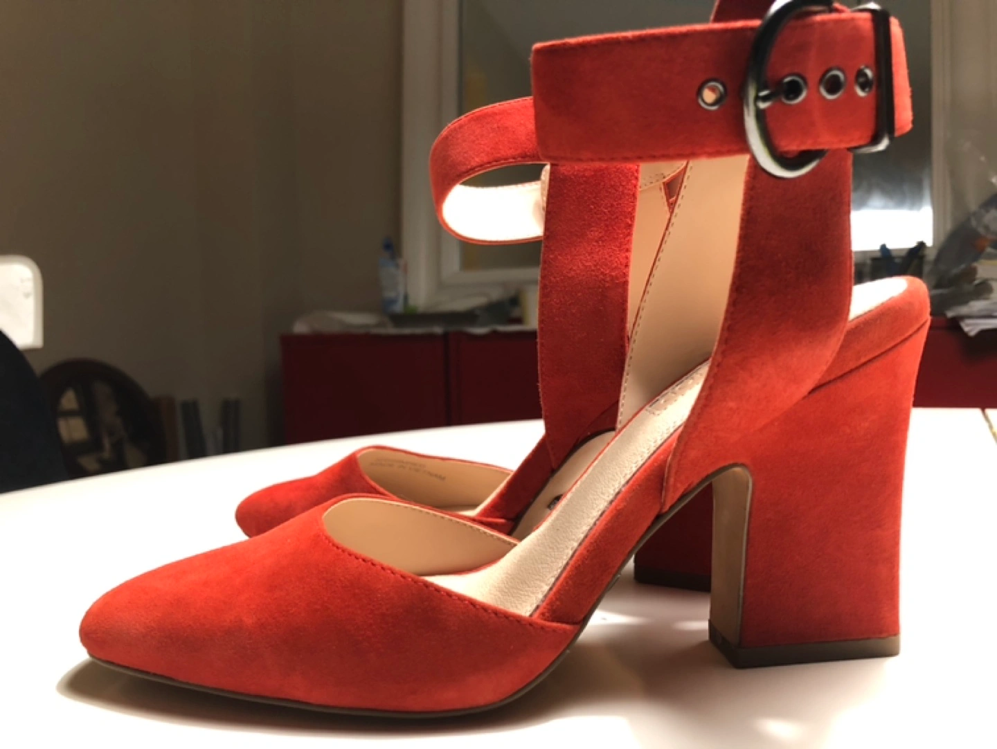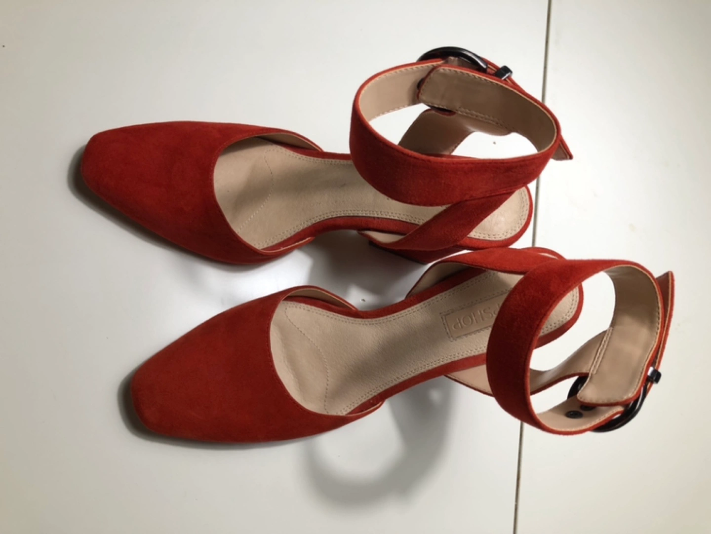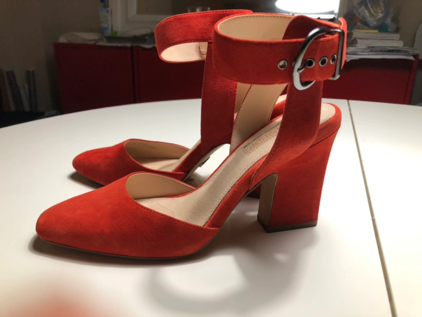 Orange suede heeled sandals with an ankle strap and buckle. Block heel, very comfortable and in like new condition