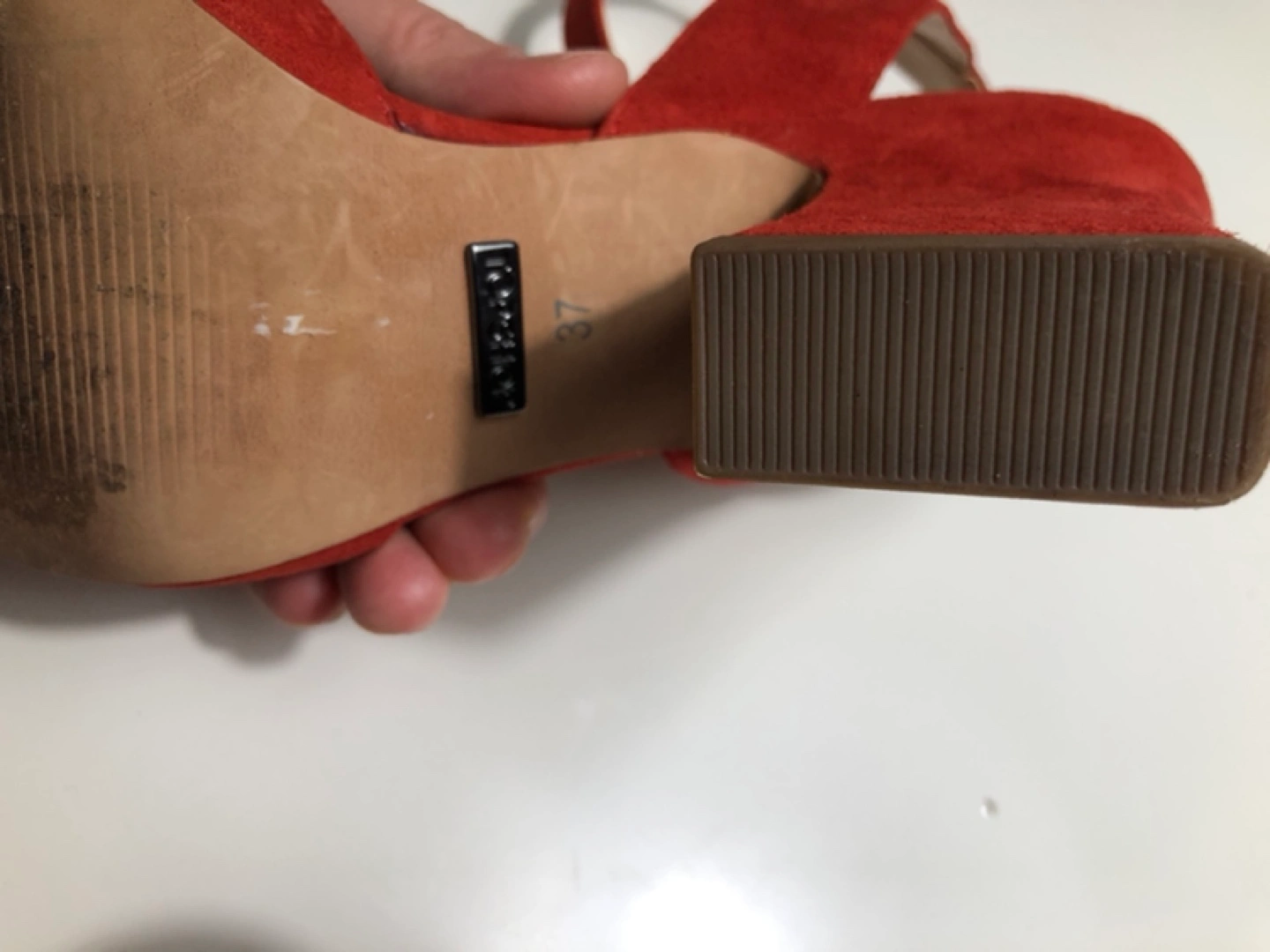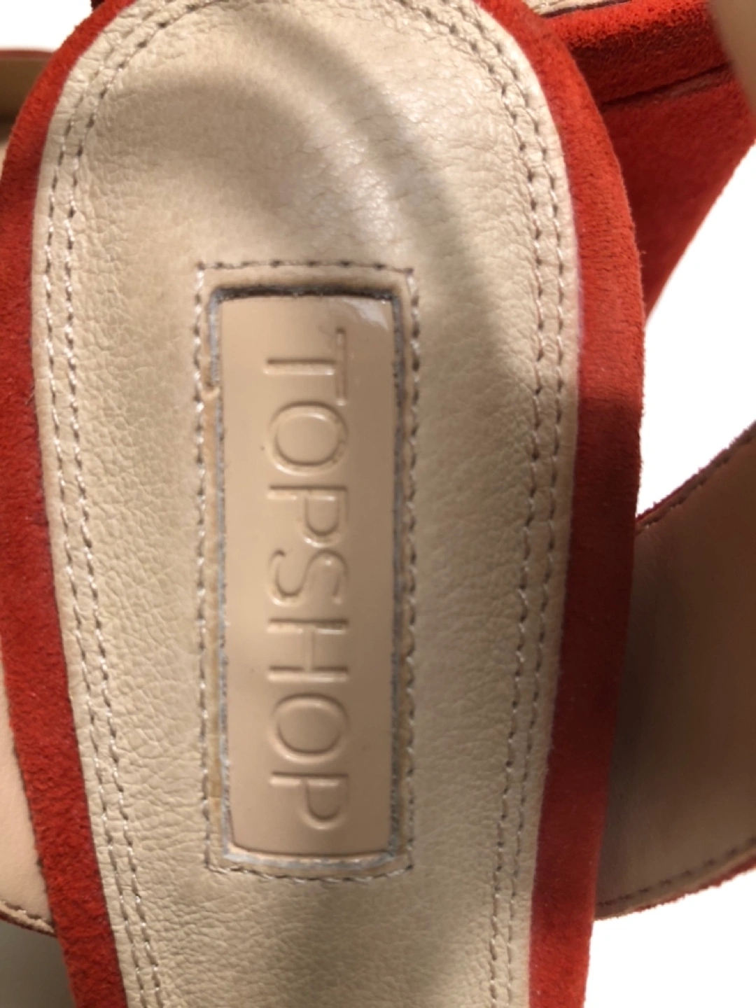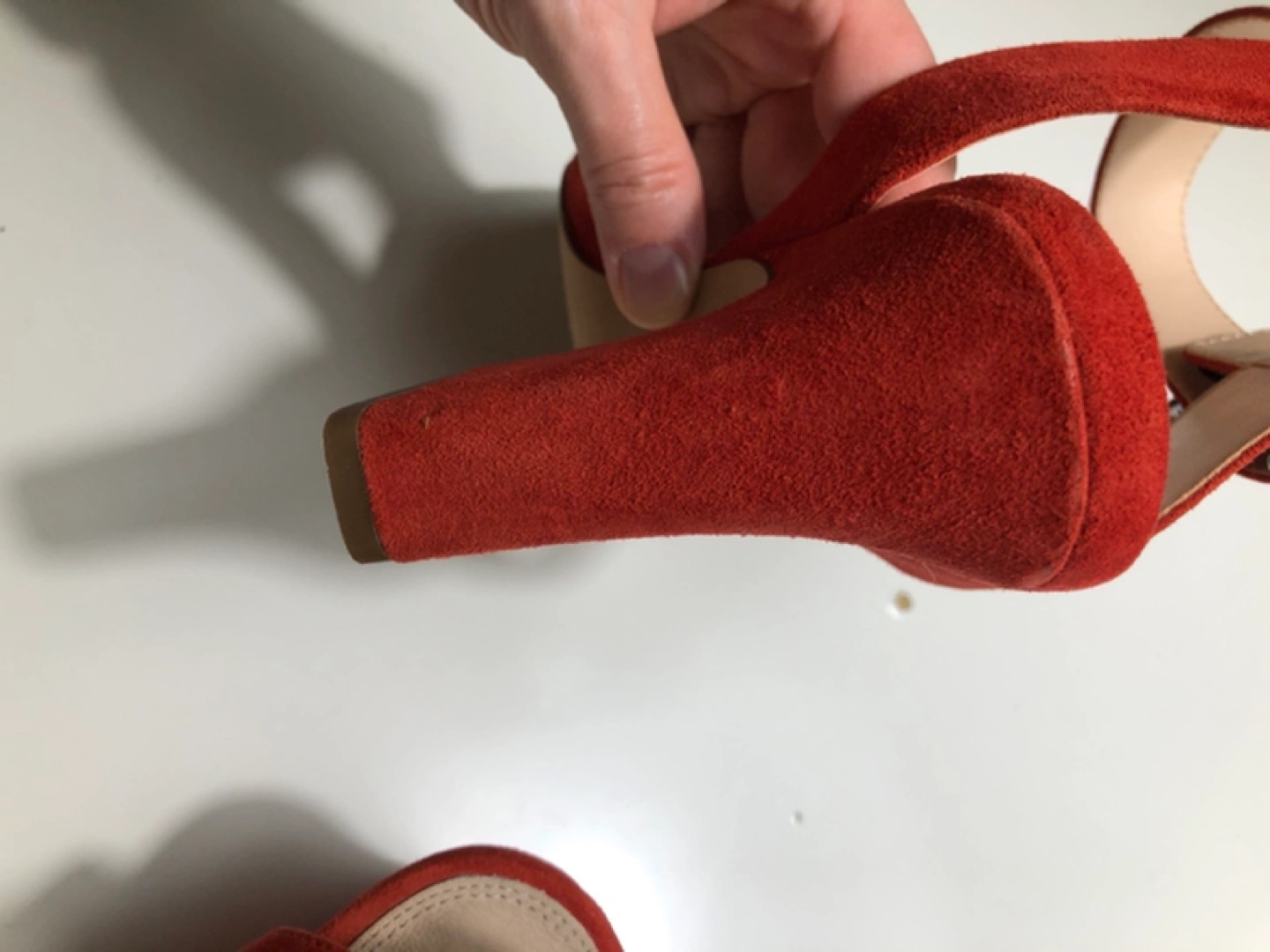 Orange suede heeled sandals with an ankle strap and buckle. Block heel, very comfortable and in like new condition