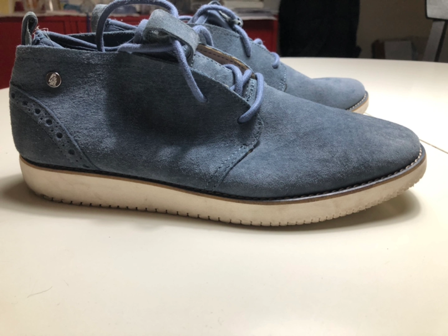 Blue suede boots with lace-up closure and a white rubber sole. Size 8. Pick up at Yonge and Eglinton