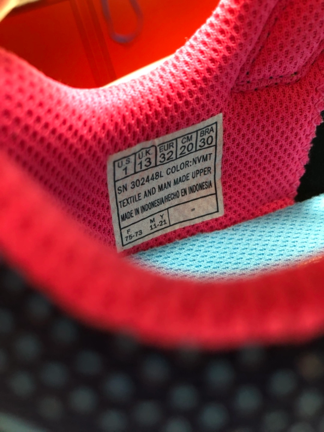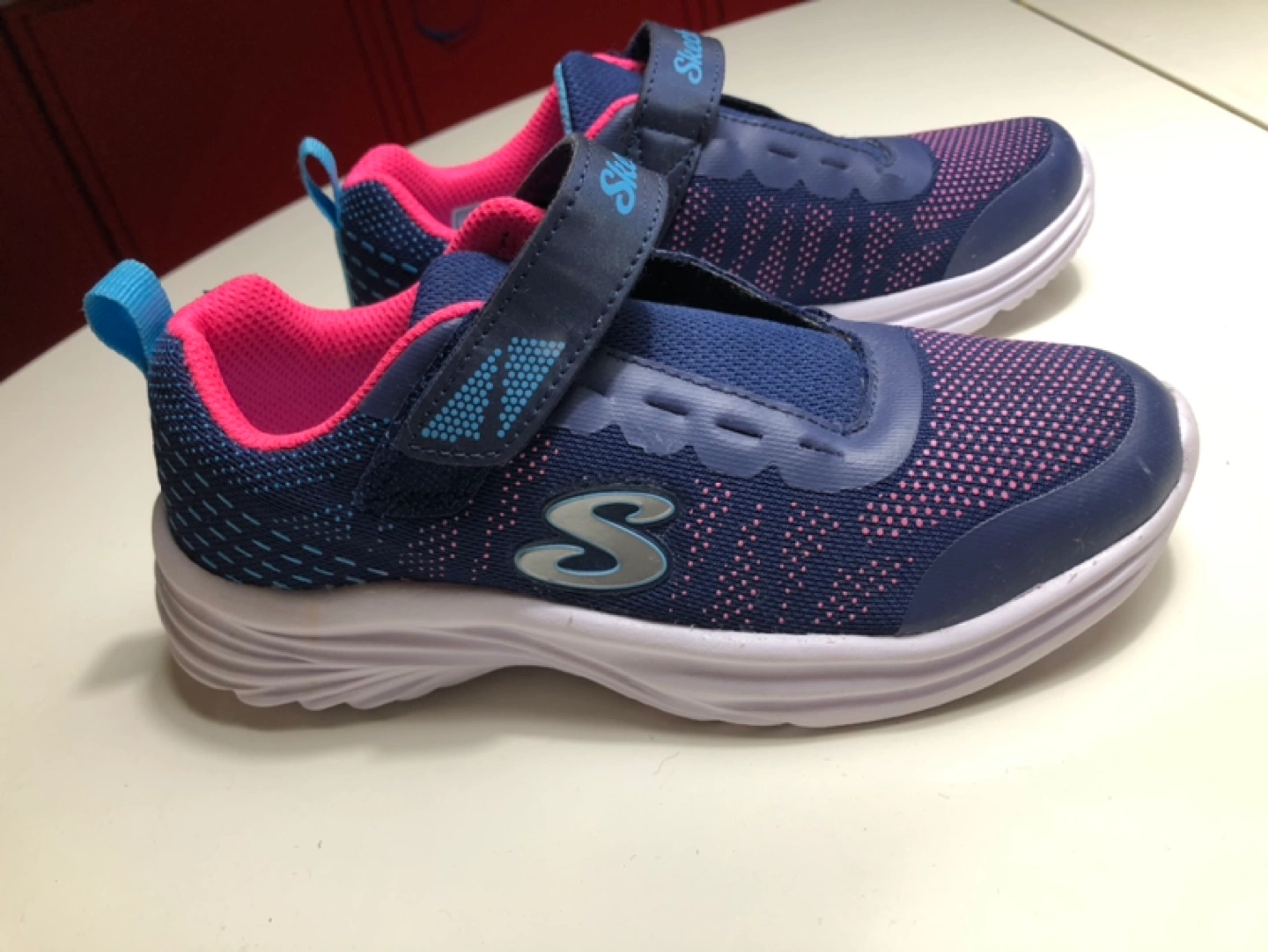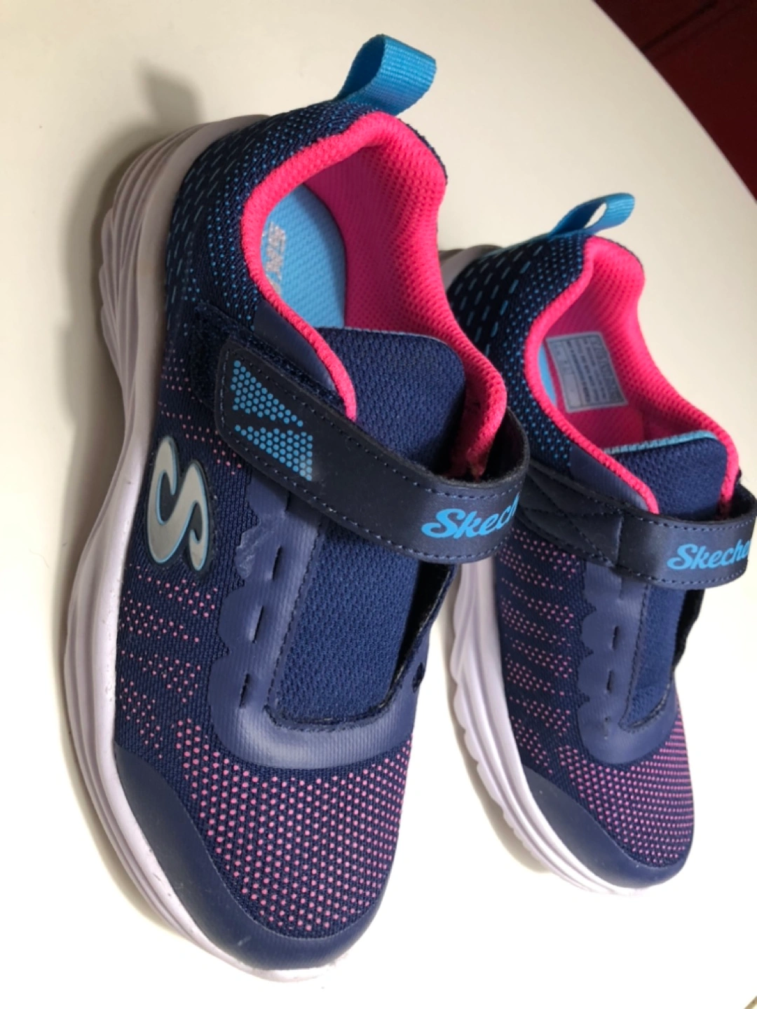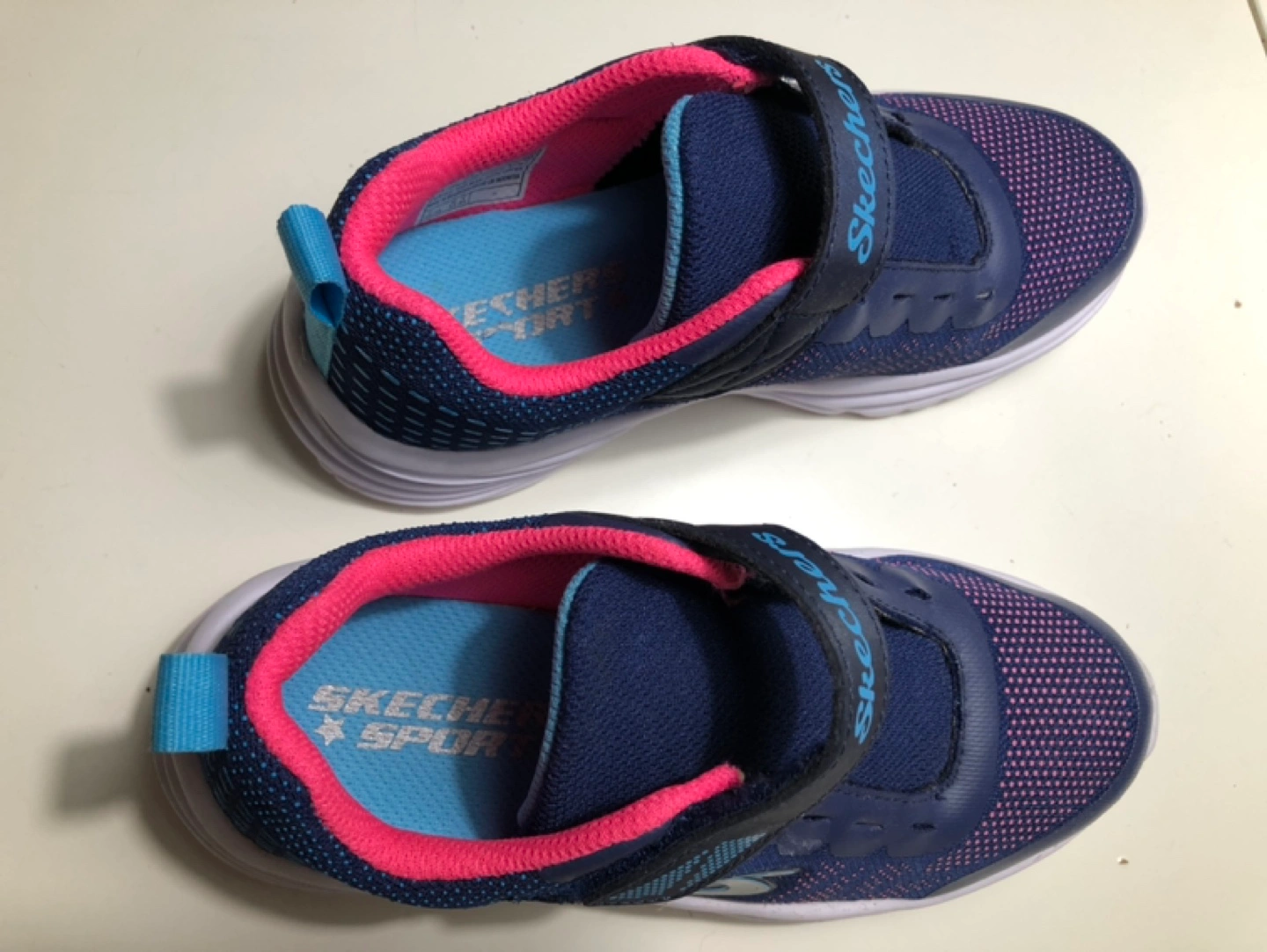 Blue, pink and white running shoes with velcro closure. Size US 1, UK 13, EUR 32, CM 20. New condition, unworn.