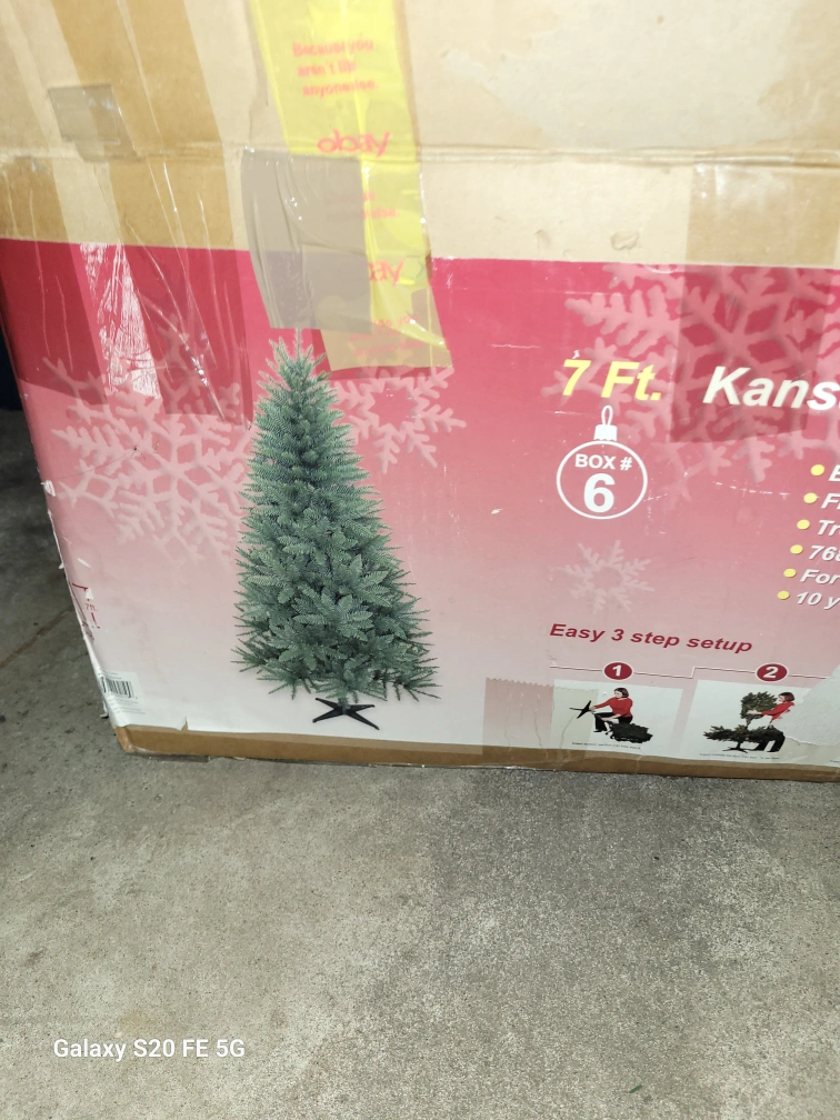 7 ft artificial Christmas tree in box. Easy 3 step setup. You can also get a lot of decorations for an extra $$