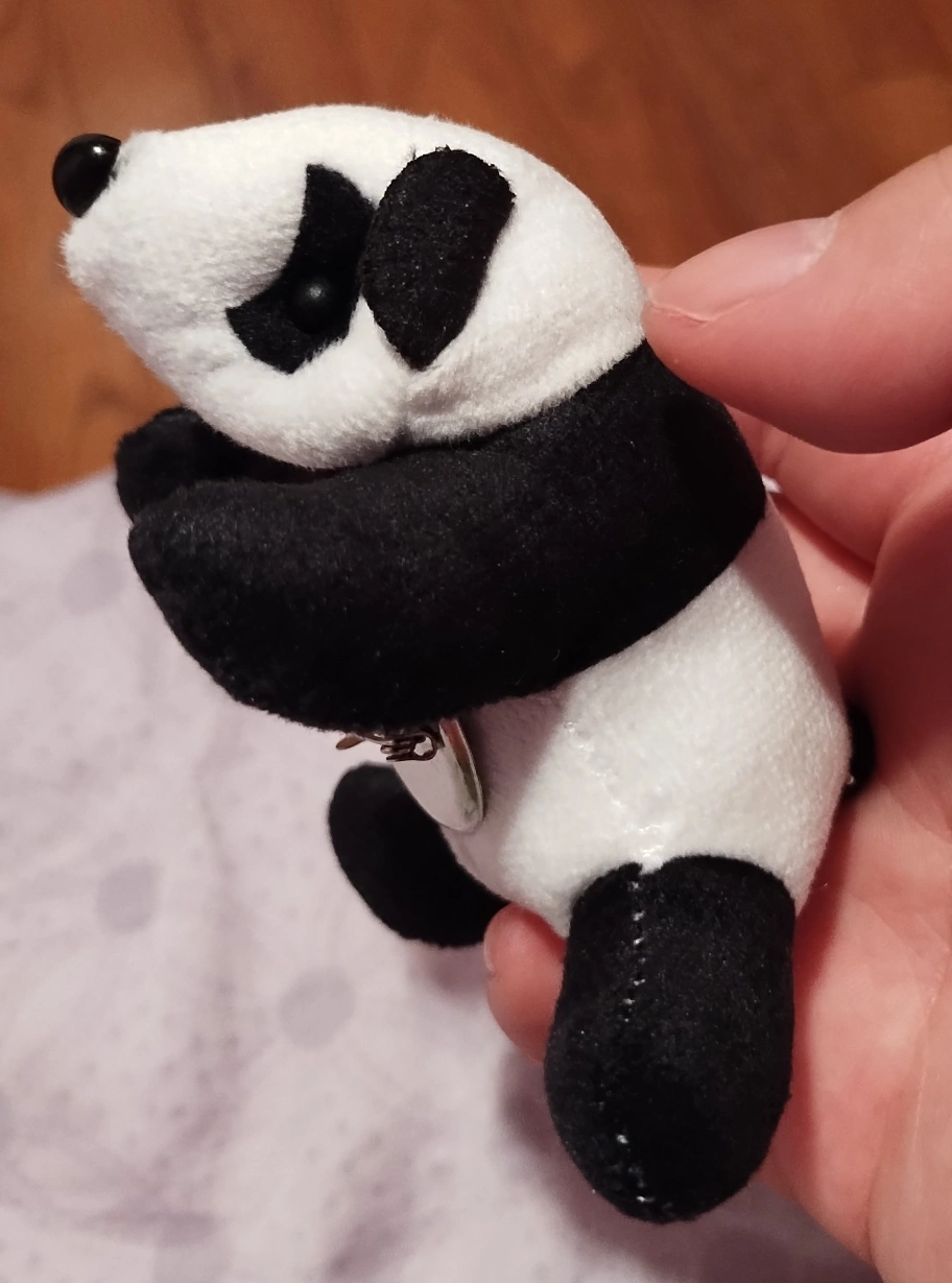 Small black and white plush panda brooch. Has a silver pin attached to its chest for you to attach to where you want on your clothes. New but with minor defects. (looks weird and doesn't look like a panda, because the face is squeezed🤣🤣🤣, due to transport? I think?) Only buy if you don't mind the defect.