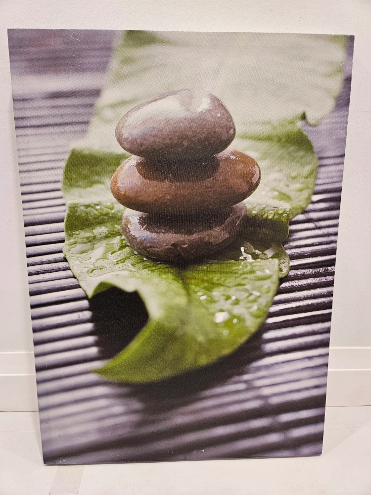 Canvas wall art featuring three smooth stones stacked on a green leaf. It is on a black mat with a bamboo pattern. Wall decor 20 x28 Inch Check my other ad more decor