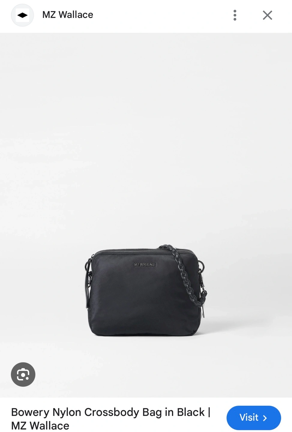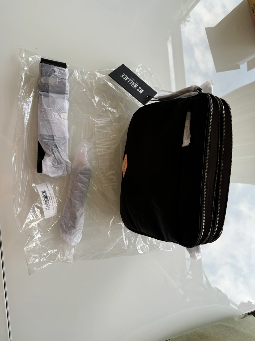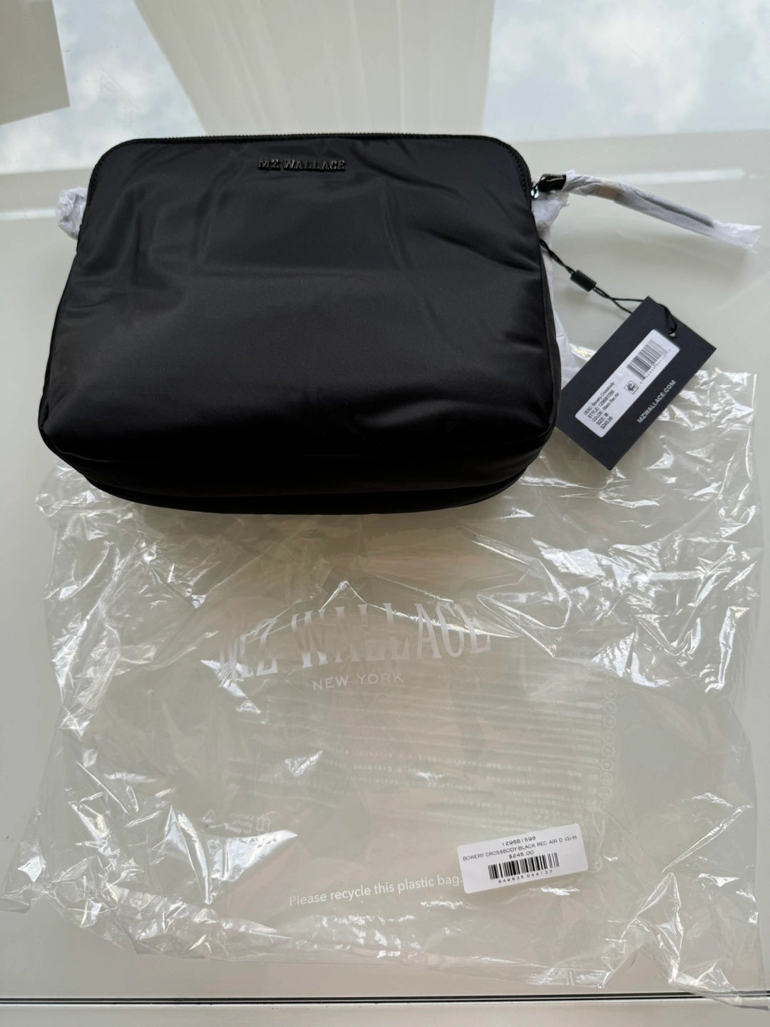 Black nylon crossbody bag with a chain strap. Two separate zippered compartments and an extra zippered pocket at the back. Comes with an adjustable strap and detachable chain. Retails for over $300 with taxes and duties.