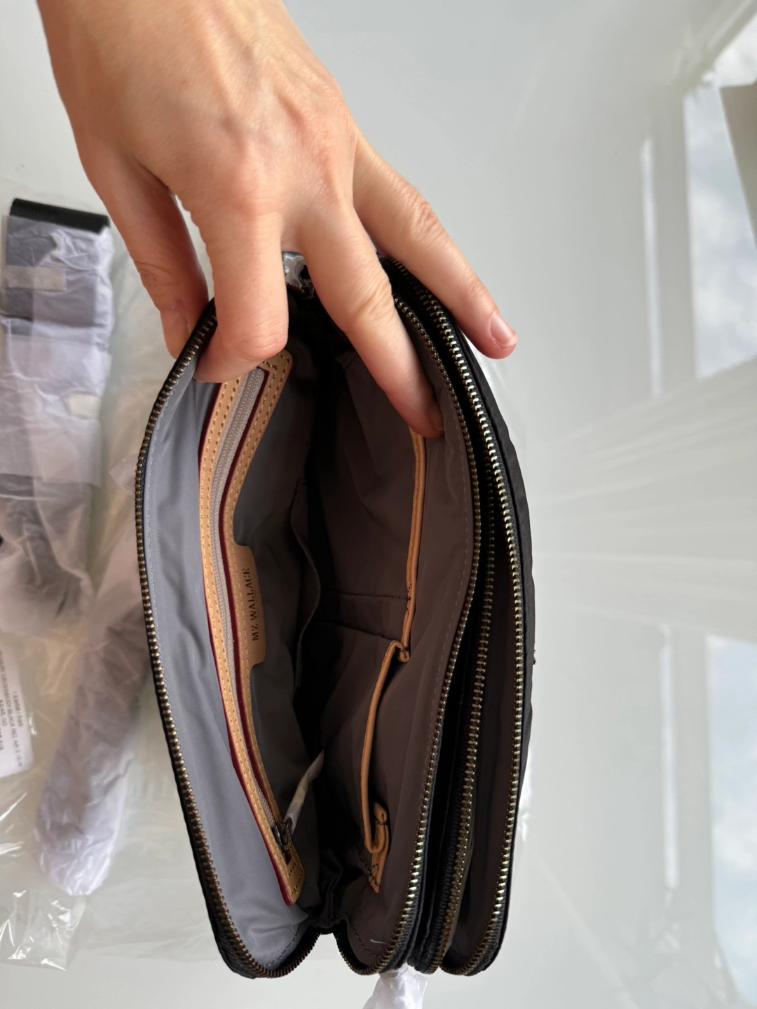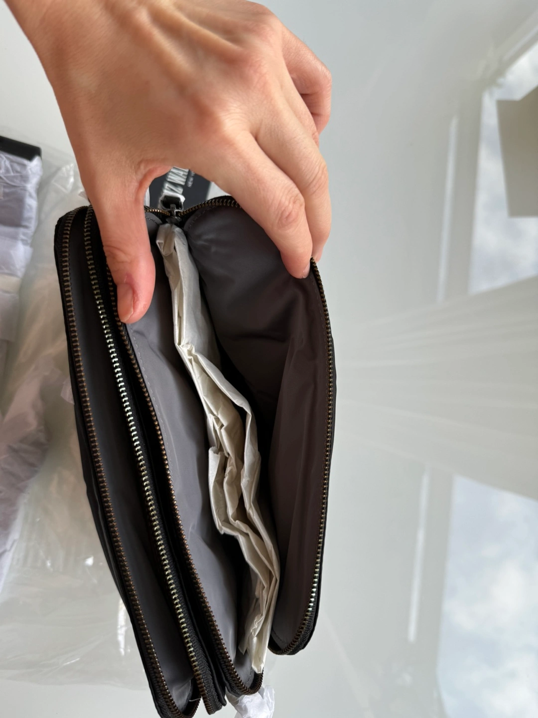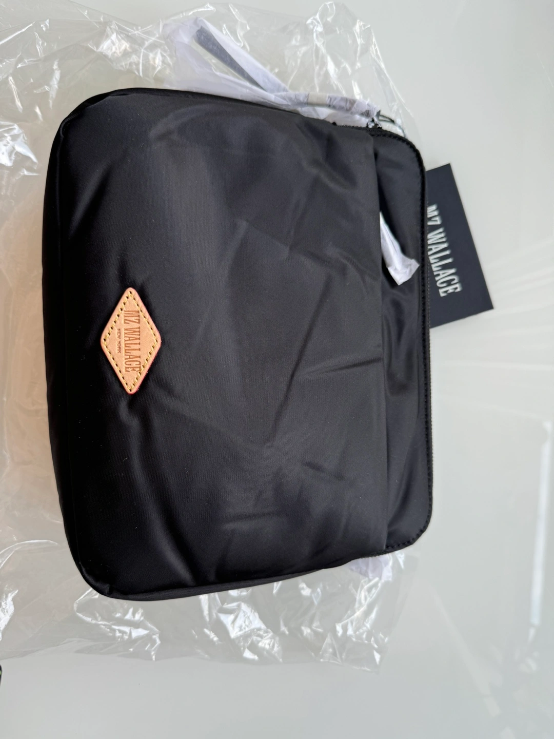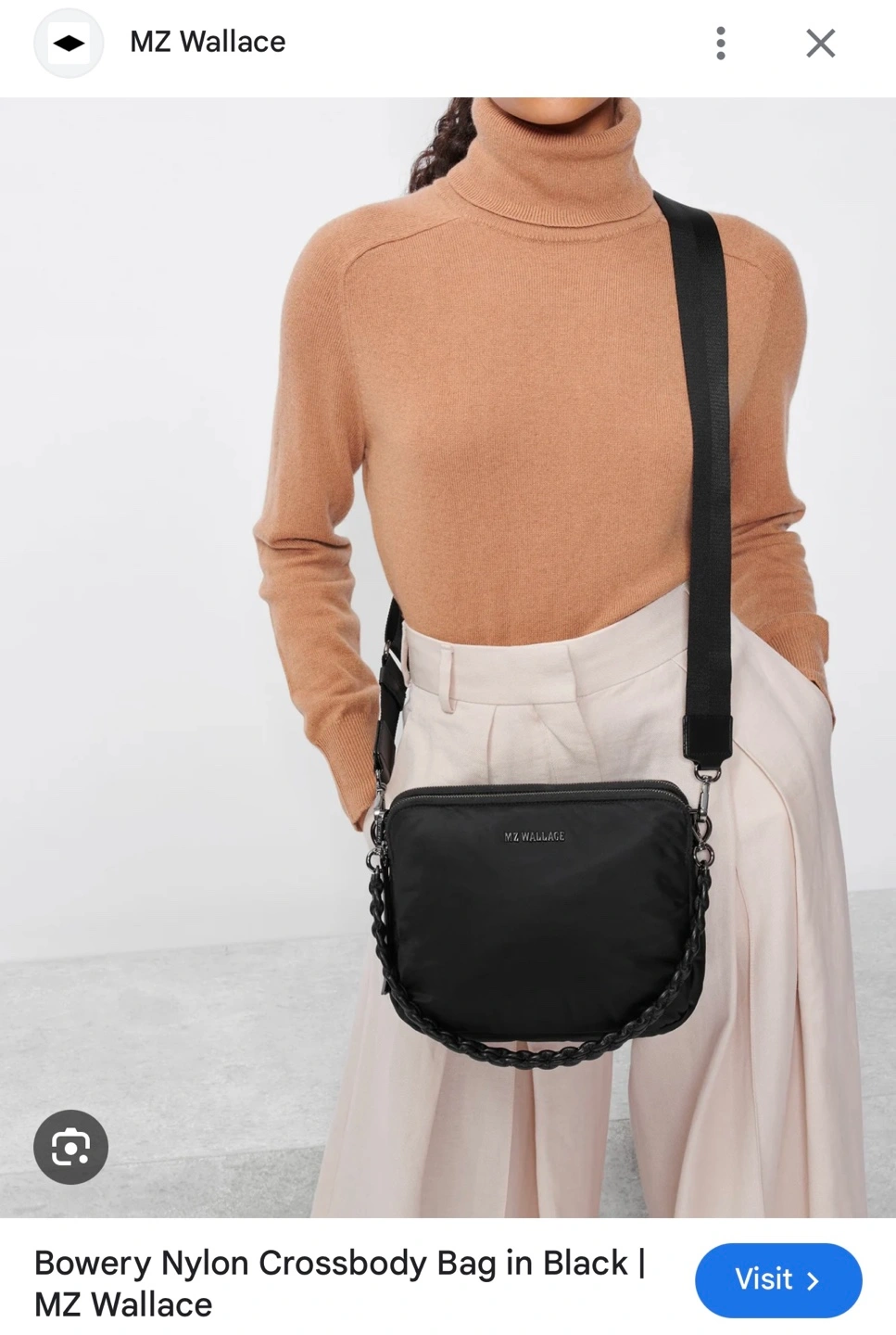 Black nylon crossbody bag with a chain strap. Two separate zippered compartments and an extra zippered pocket at the back. Comes with an adjustable strap and detachable chain. Retails for over $300 with taxes and duties.