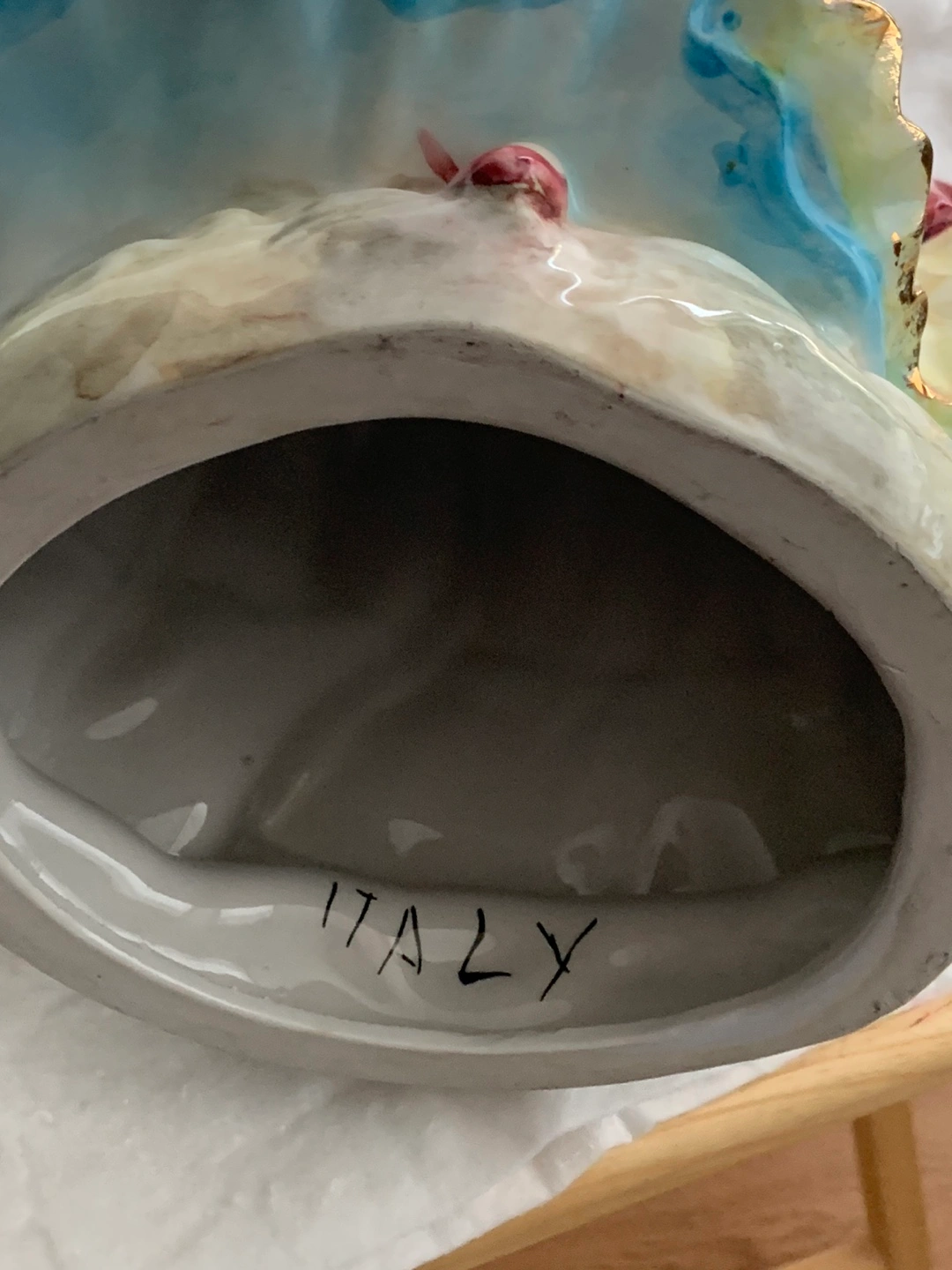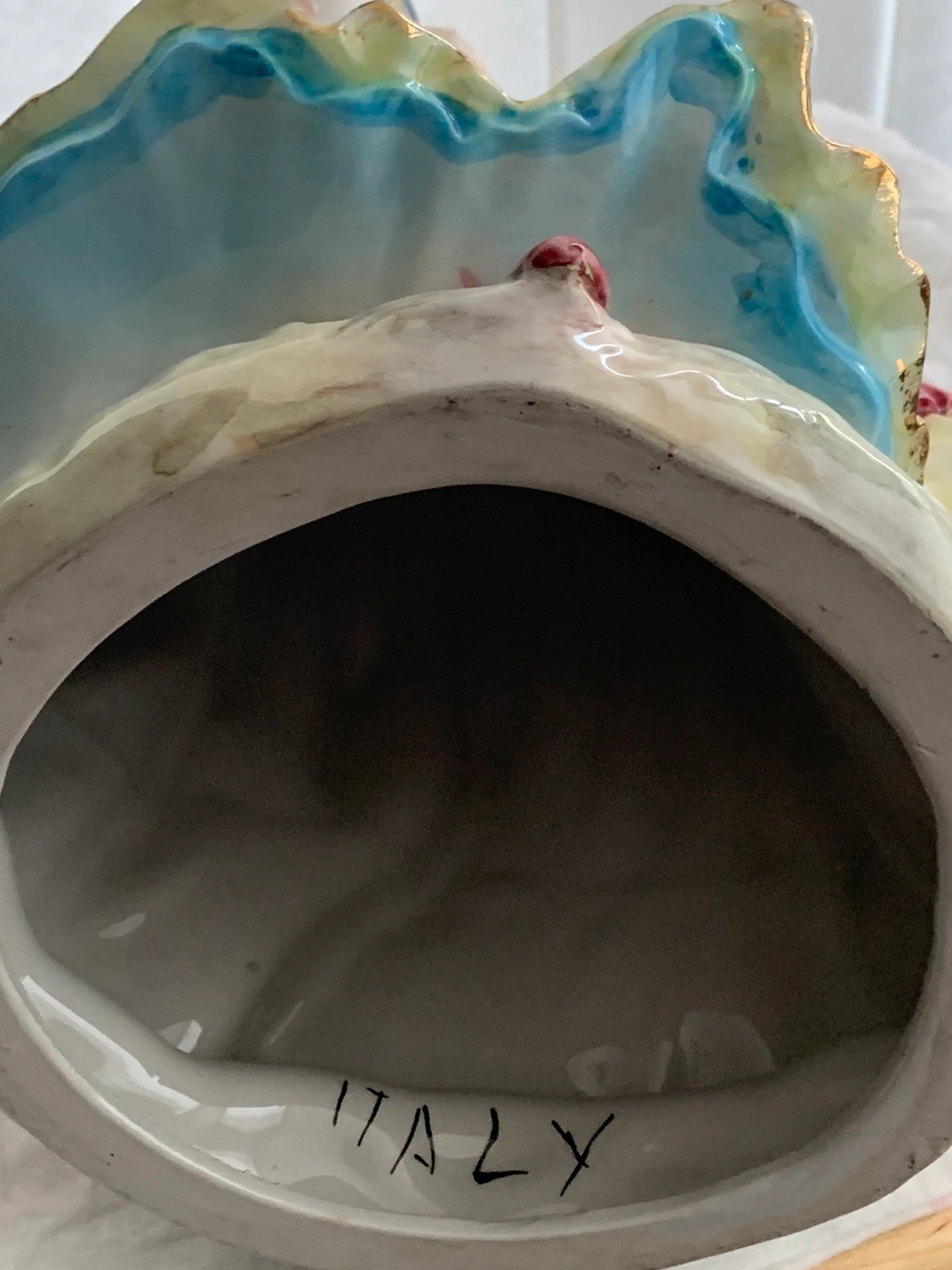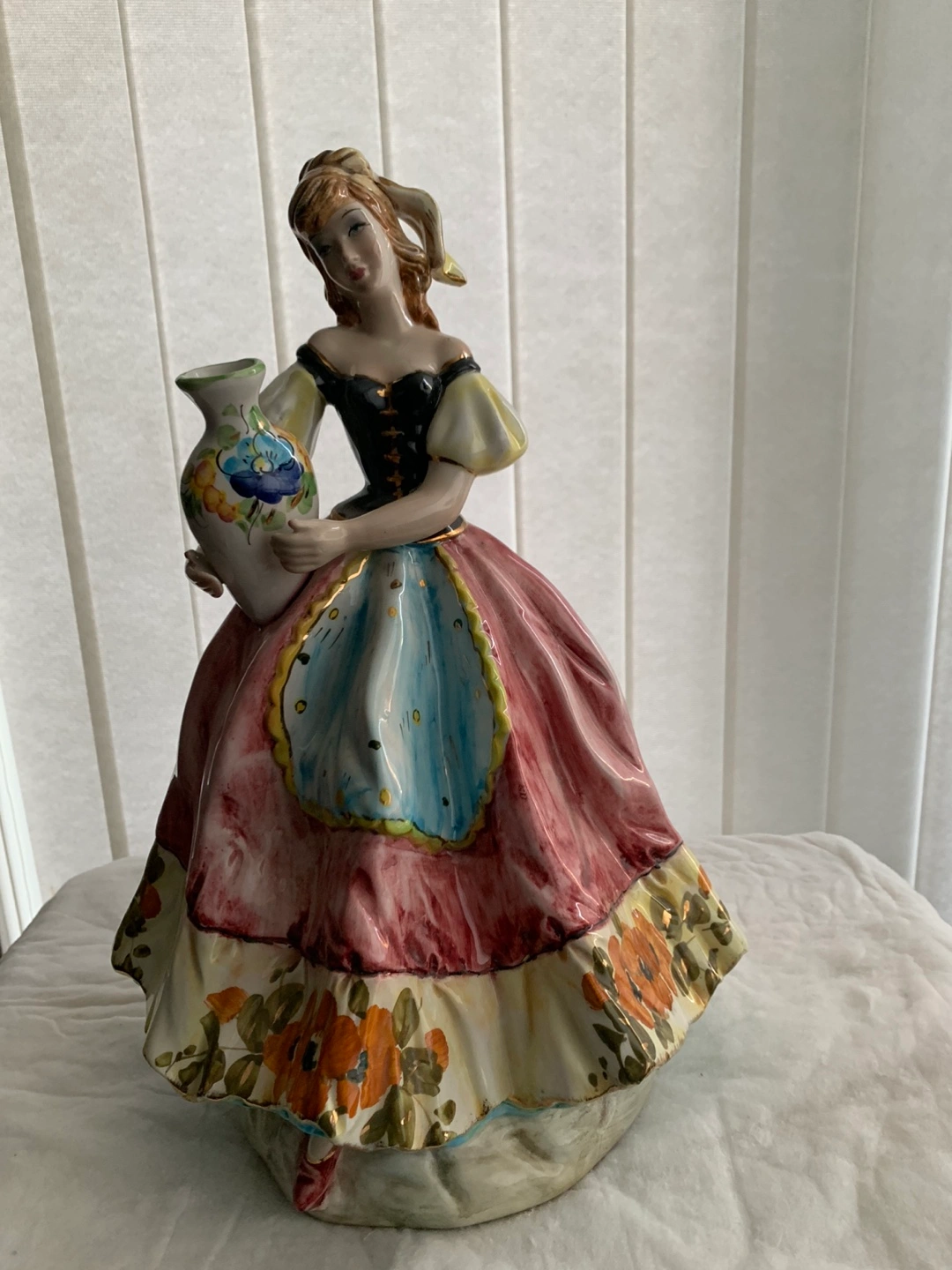 Vintage hand-painted ceramic figurine of a woman holding a vase. Made in Italy. 16” tall & about 12” at base.
