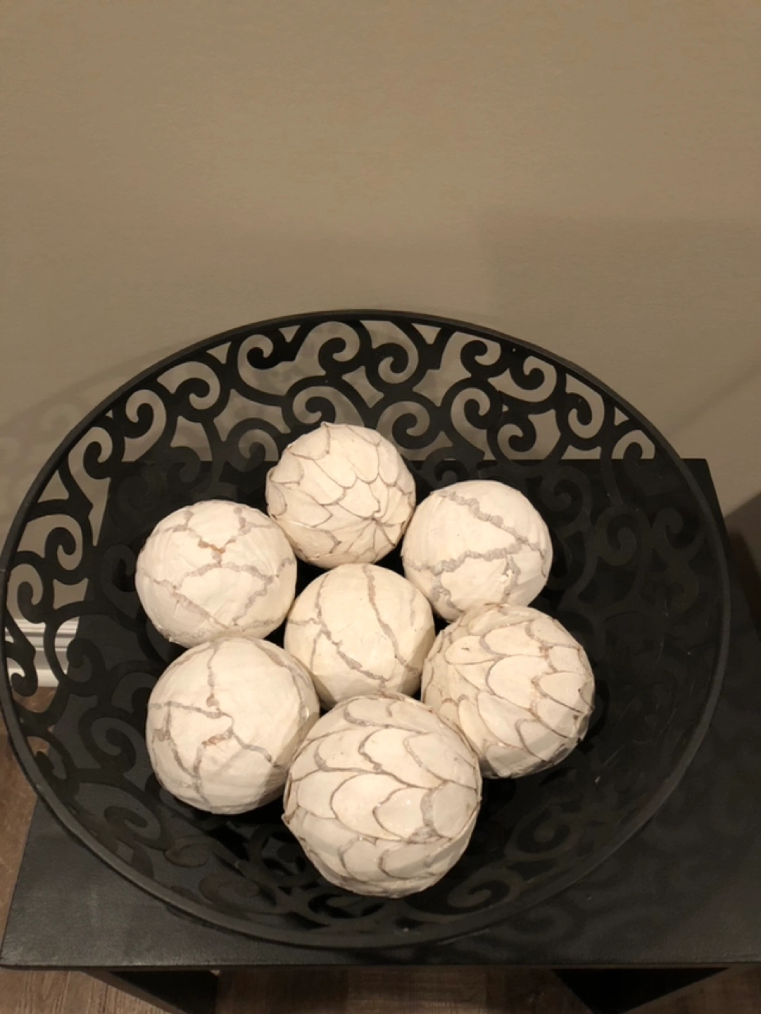 Large Black Metal Bowl and set of decorative balls. White with a textured finish. Sold as a set.