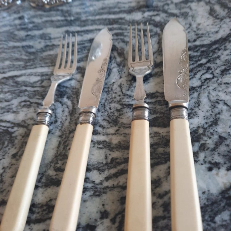 Set has 2 forks and 6 knives The handles are ivory and intricate etchings cover the silverware.Can use the extra knives to complete a full sete when you find more on site.