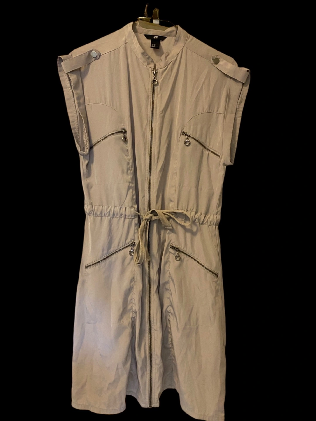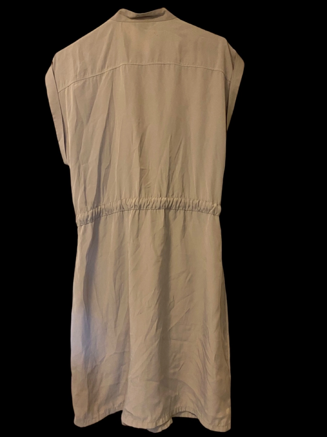 Grey dress with a zipper closure, pockets, and a tie belt.Size 6.