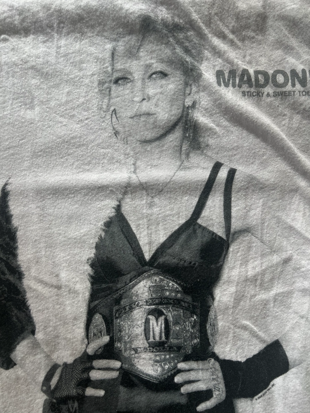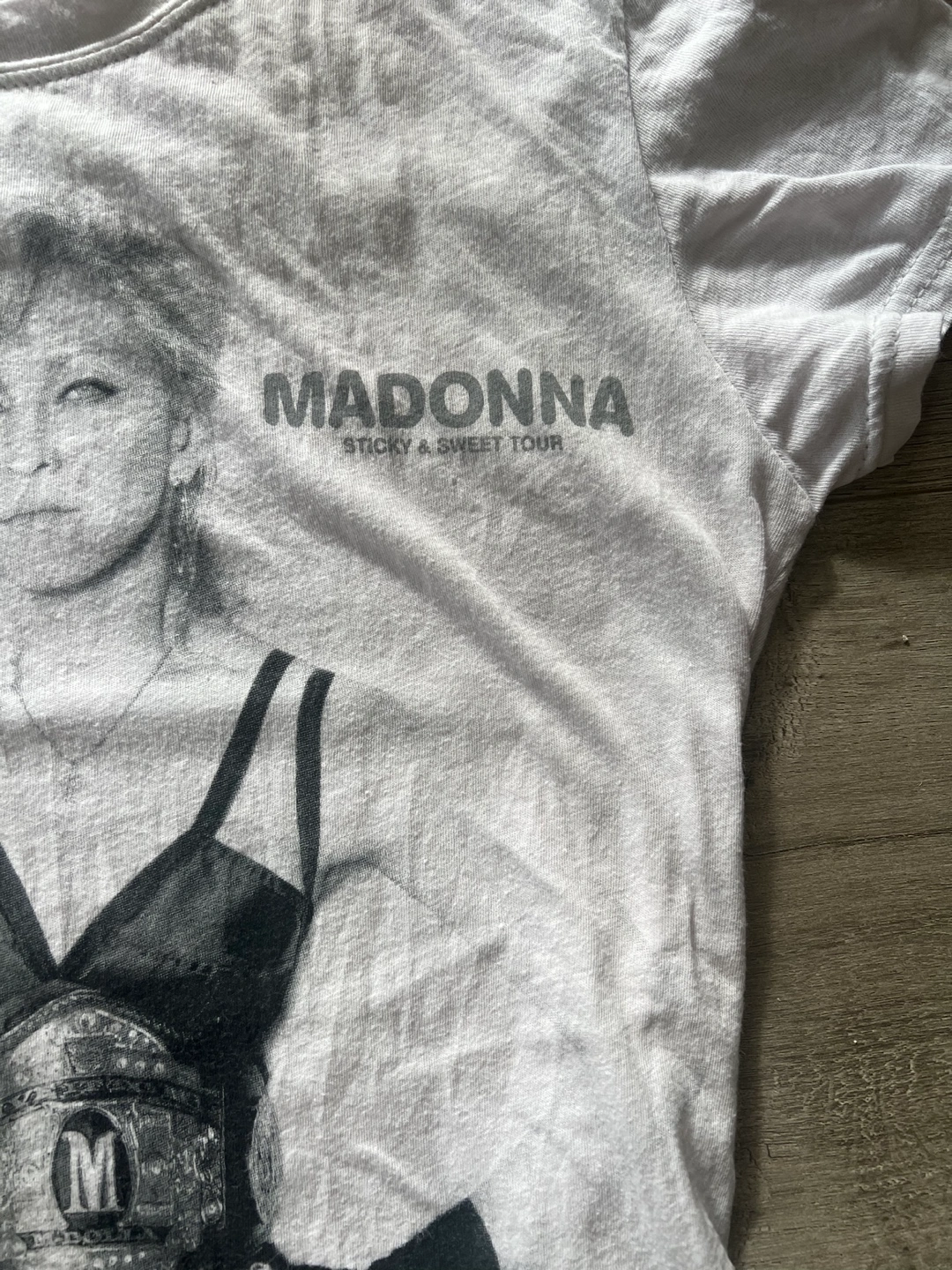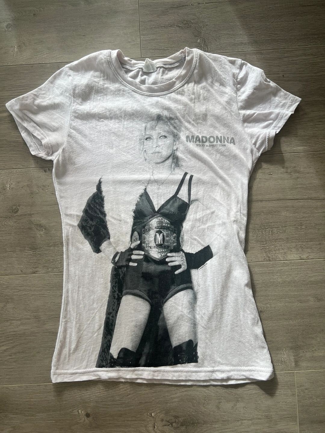 Grey t-shirt featuring a black and white image of Madonna with a belt. Short sleeves and a crew neck. Official tour merchandise! Size S / Small