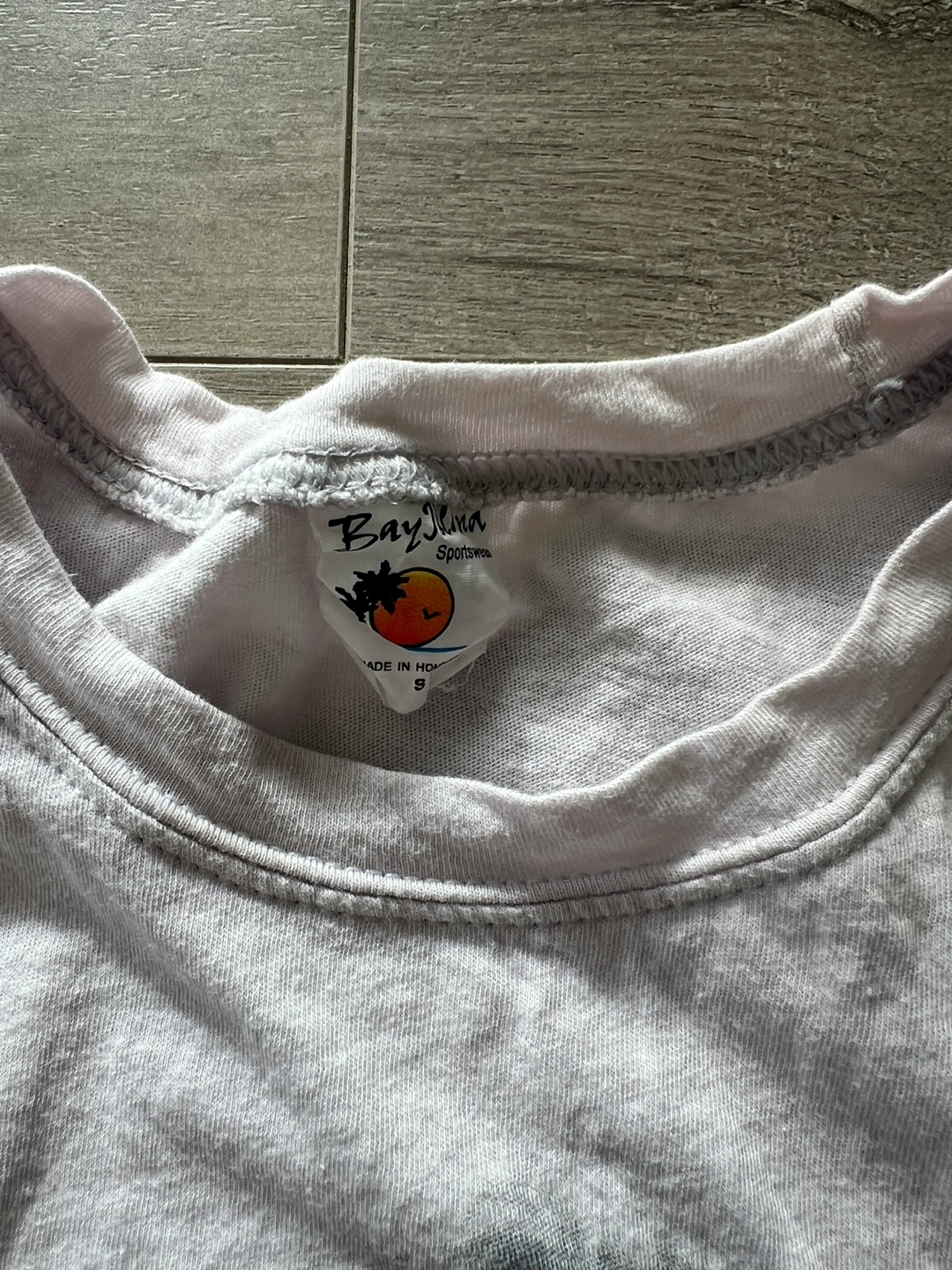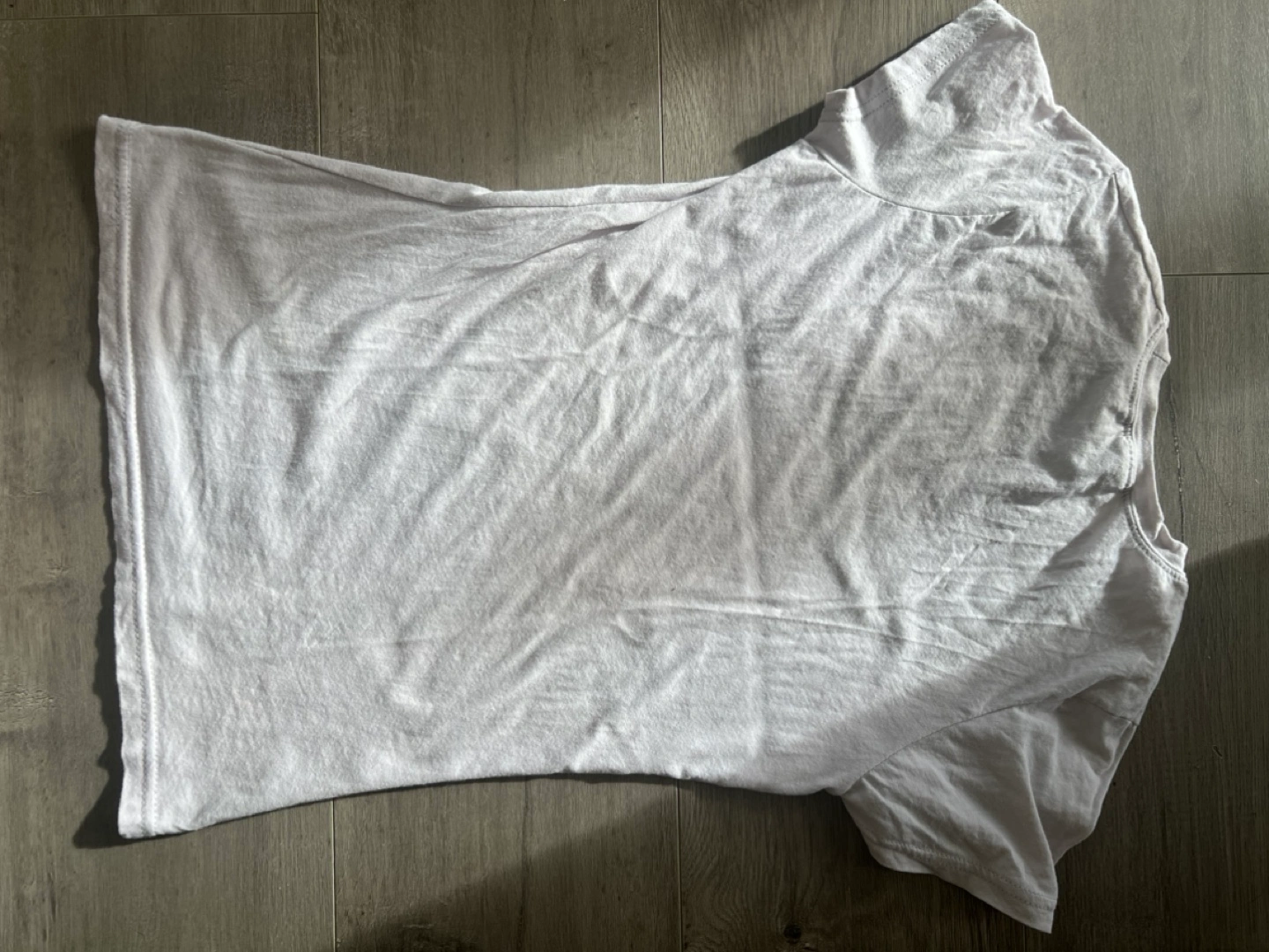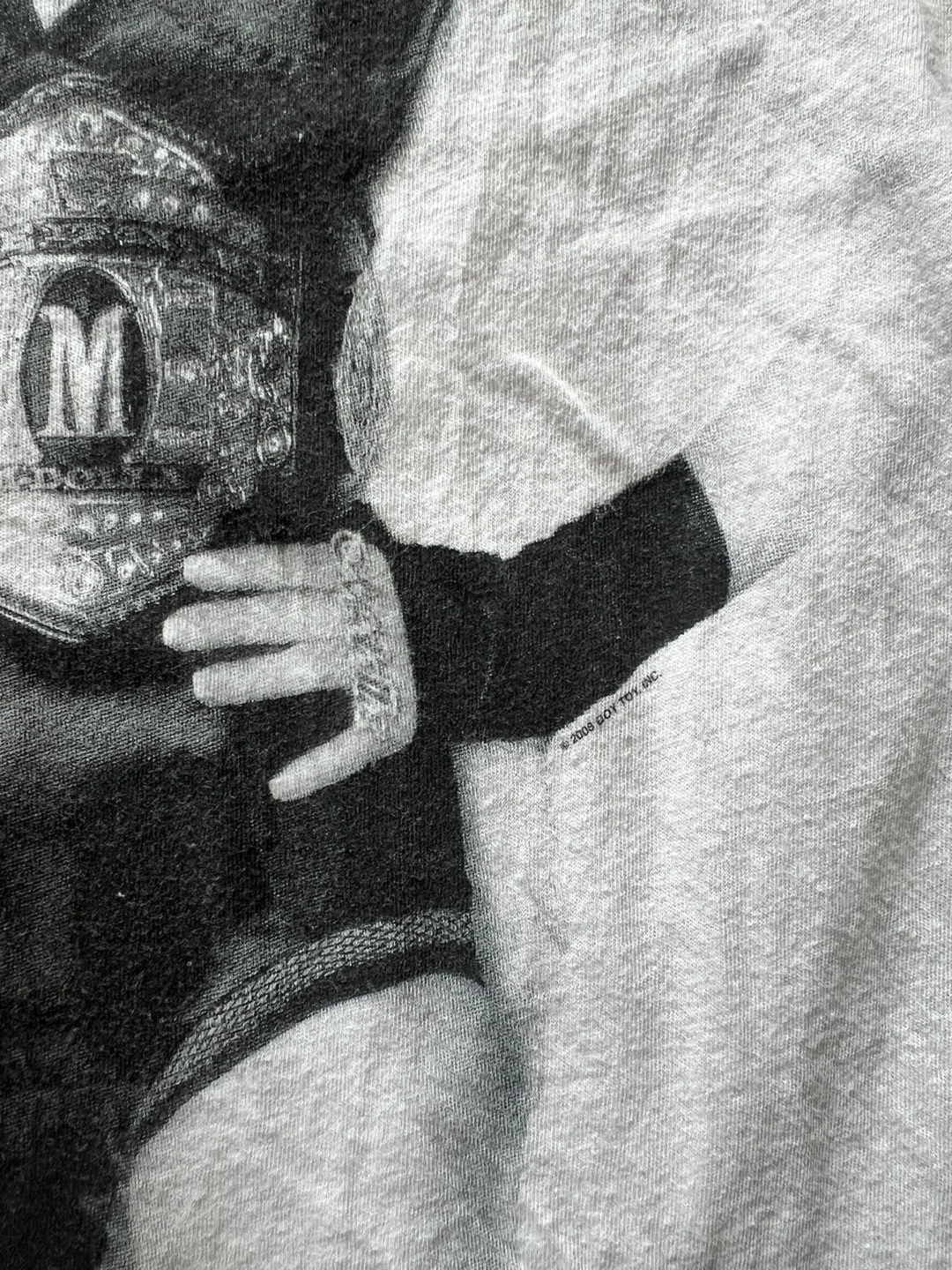 Grey t-shirt featuring a black and white image of Madonna with a belt. Short sleeves and a crew neck. Official tour merchandise! Size S / Small