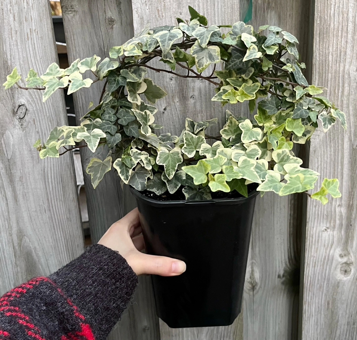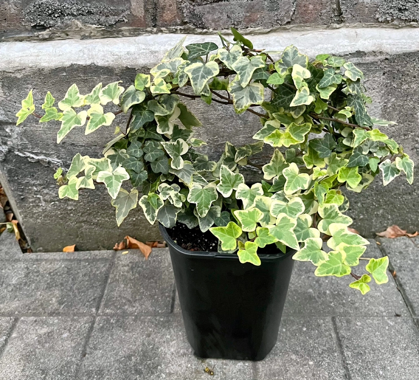 Healthy variegated ivy plant in a 6” black pot. Easy to care for and grows quickly.