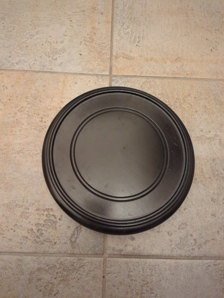 Round wooden pedestal stand. Black lacquered finish. Four legs. Good condition. size: 7 1/2 inches pick up only