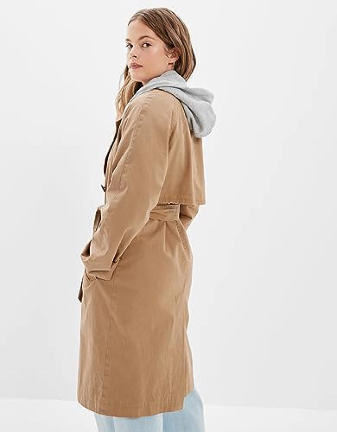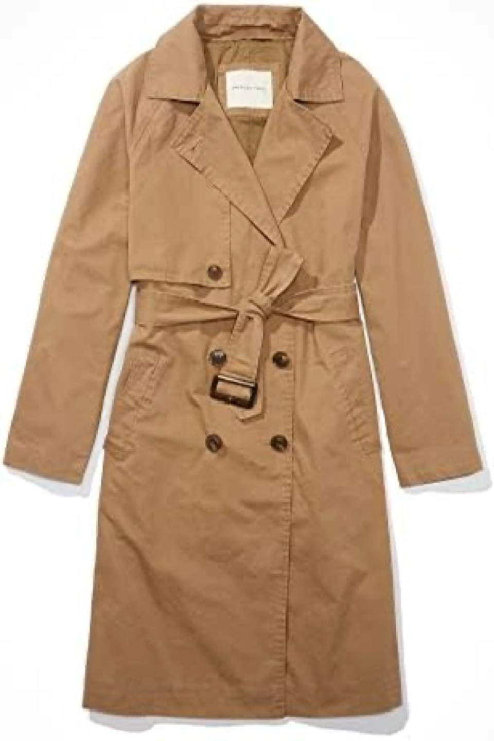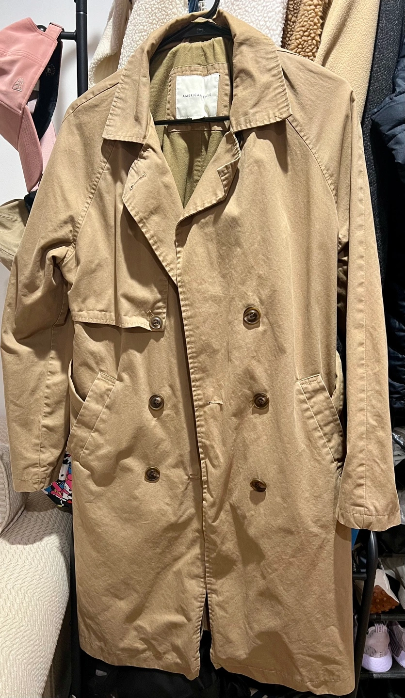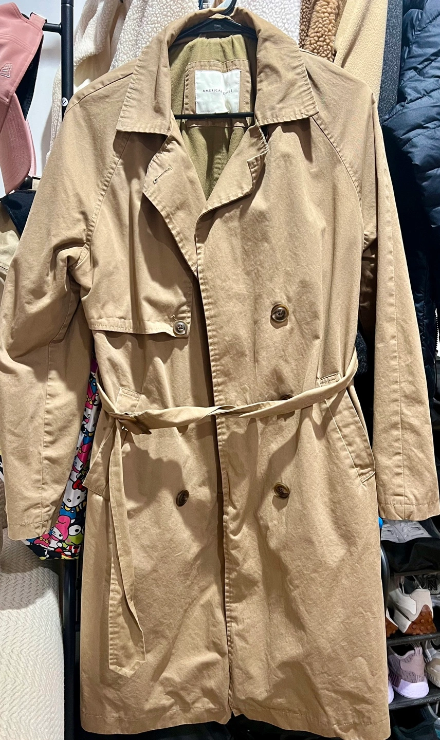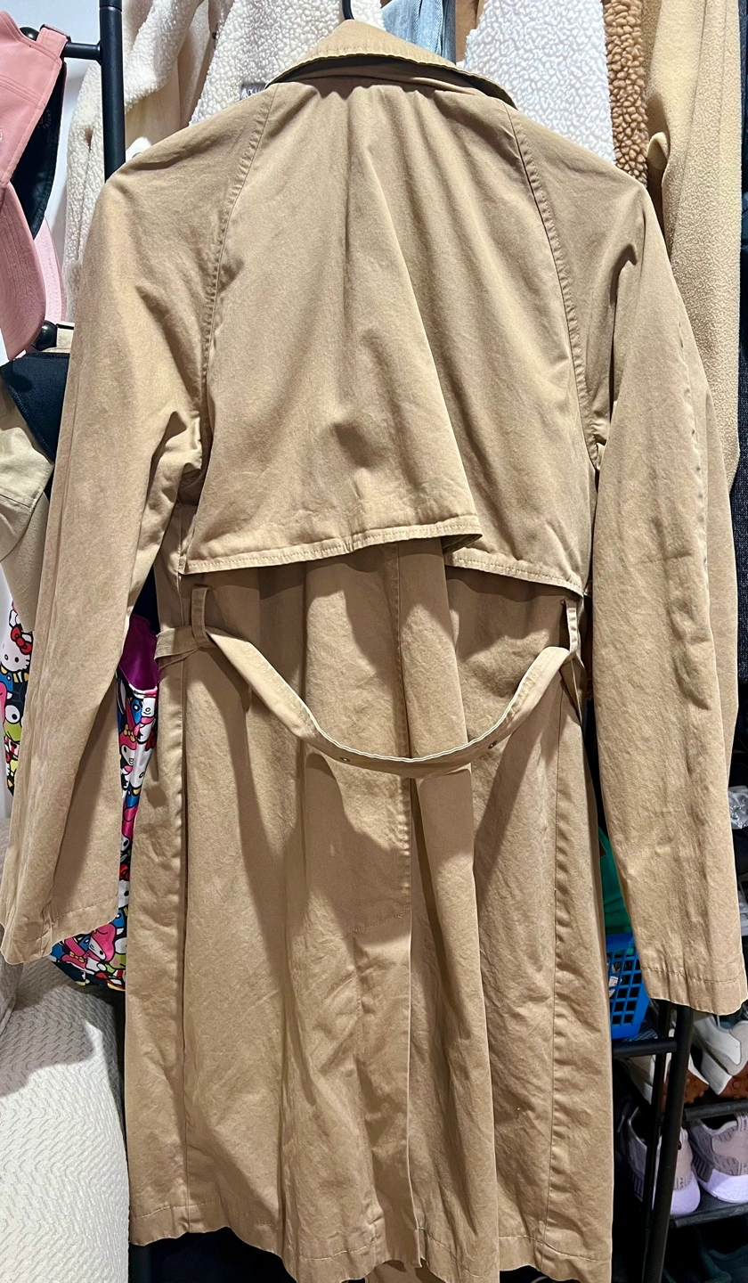Tan trench coat with a belt. Double breasted with two pockets