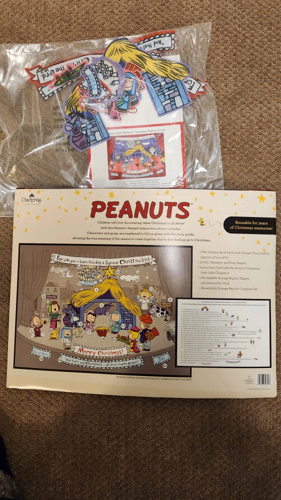 Reusable felt advent calendar with a Peanuts theme. Includes felt characters and pieces to place on the calendar. Includes instruction guide.