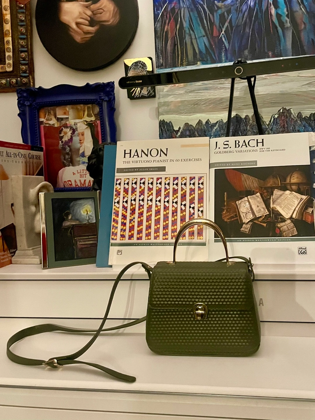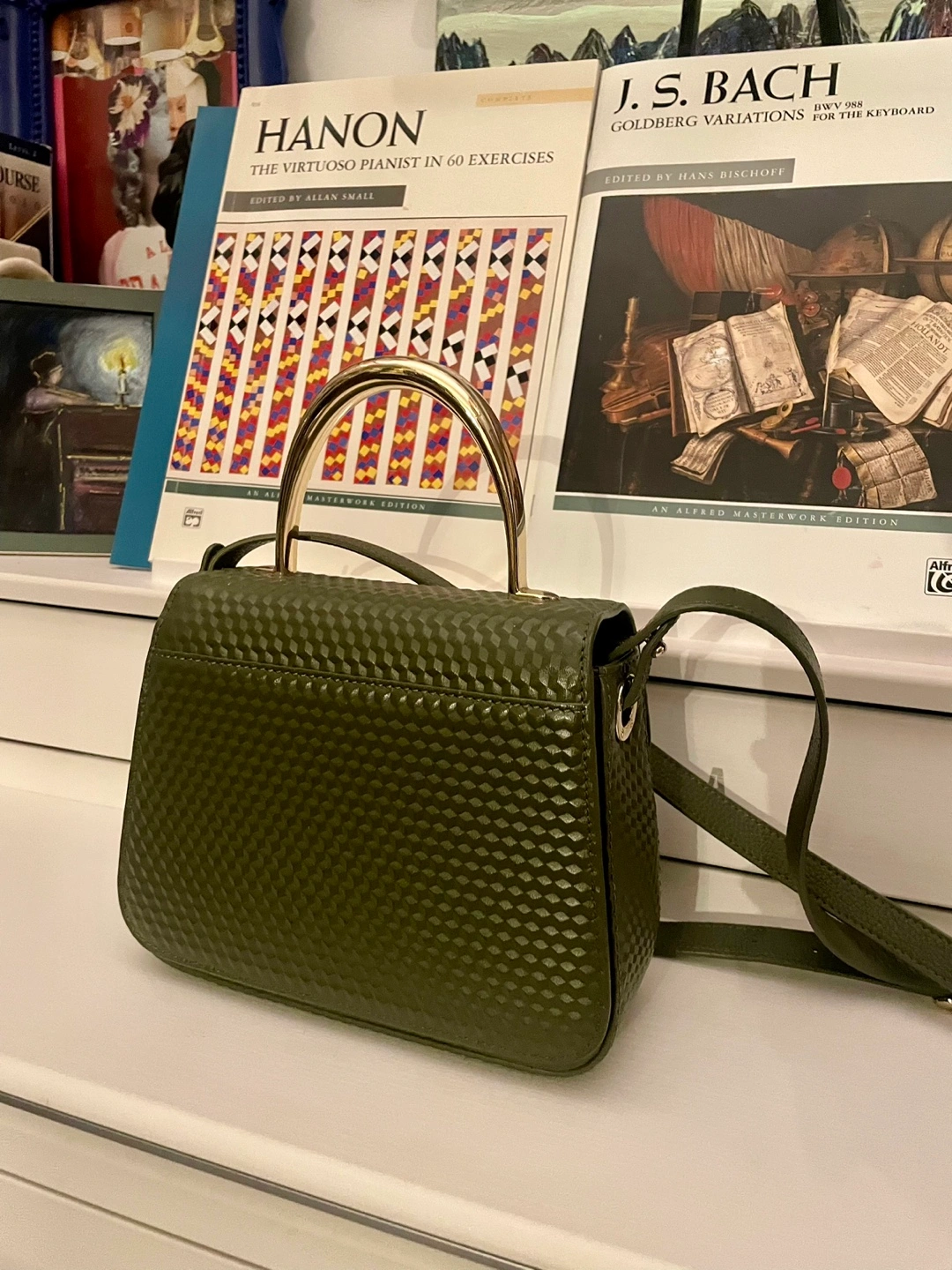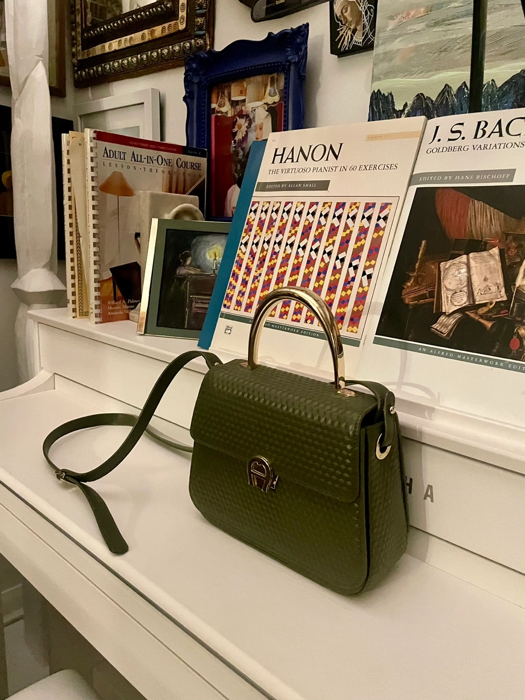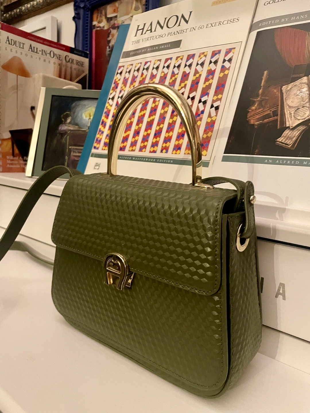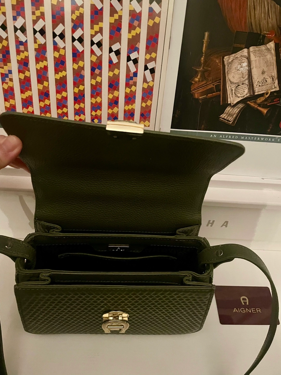 Rarely used Aigner Genoveva shoulder bag, purchased in Germany, dust bag included. Stylish, structured top-handle bag, olive green leather. Sleek top metallic handle, front clasp closure. Elegant and functional, suitable for an elevated everyday look. 6 1/2” x 8 1/2” x 3” Pick up around Sherbourne/ Wellesley Could ship/ deliver for a fee