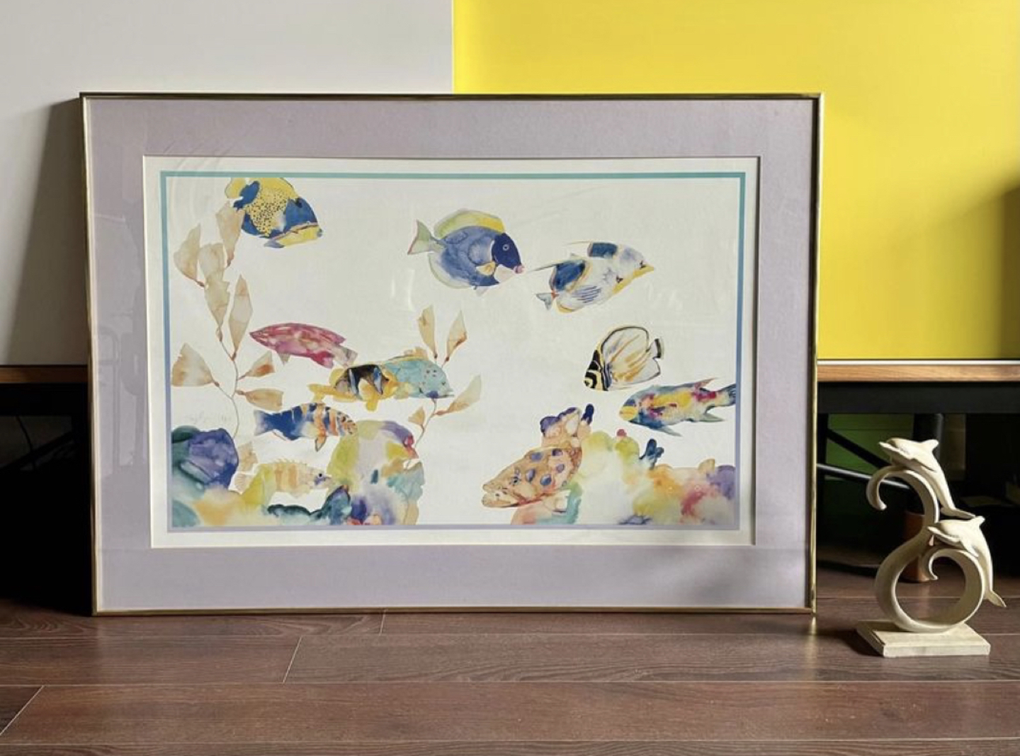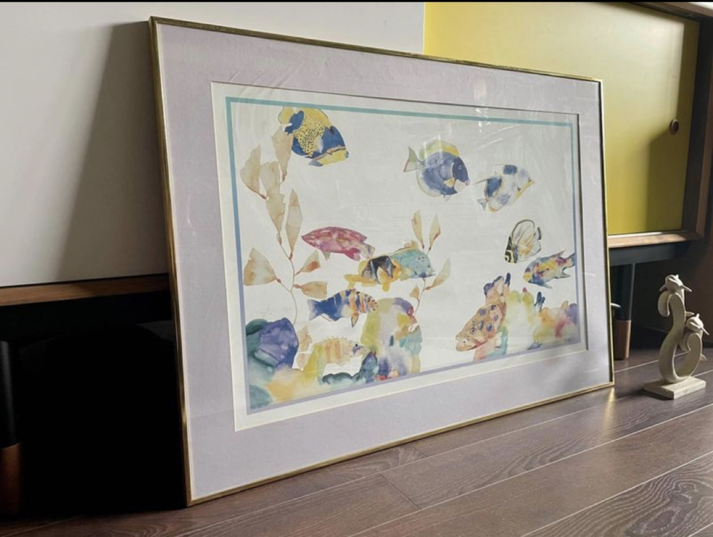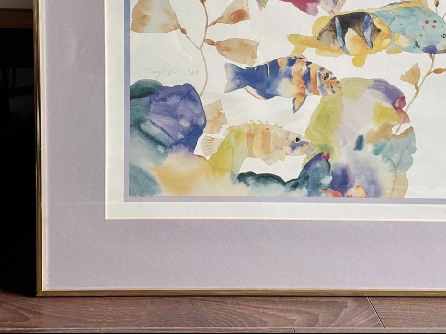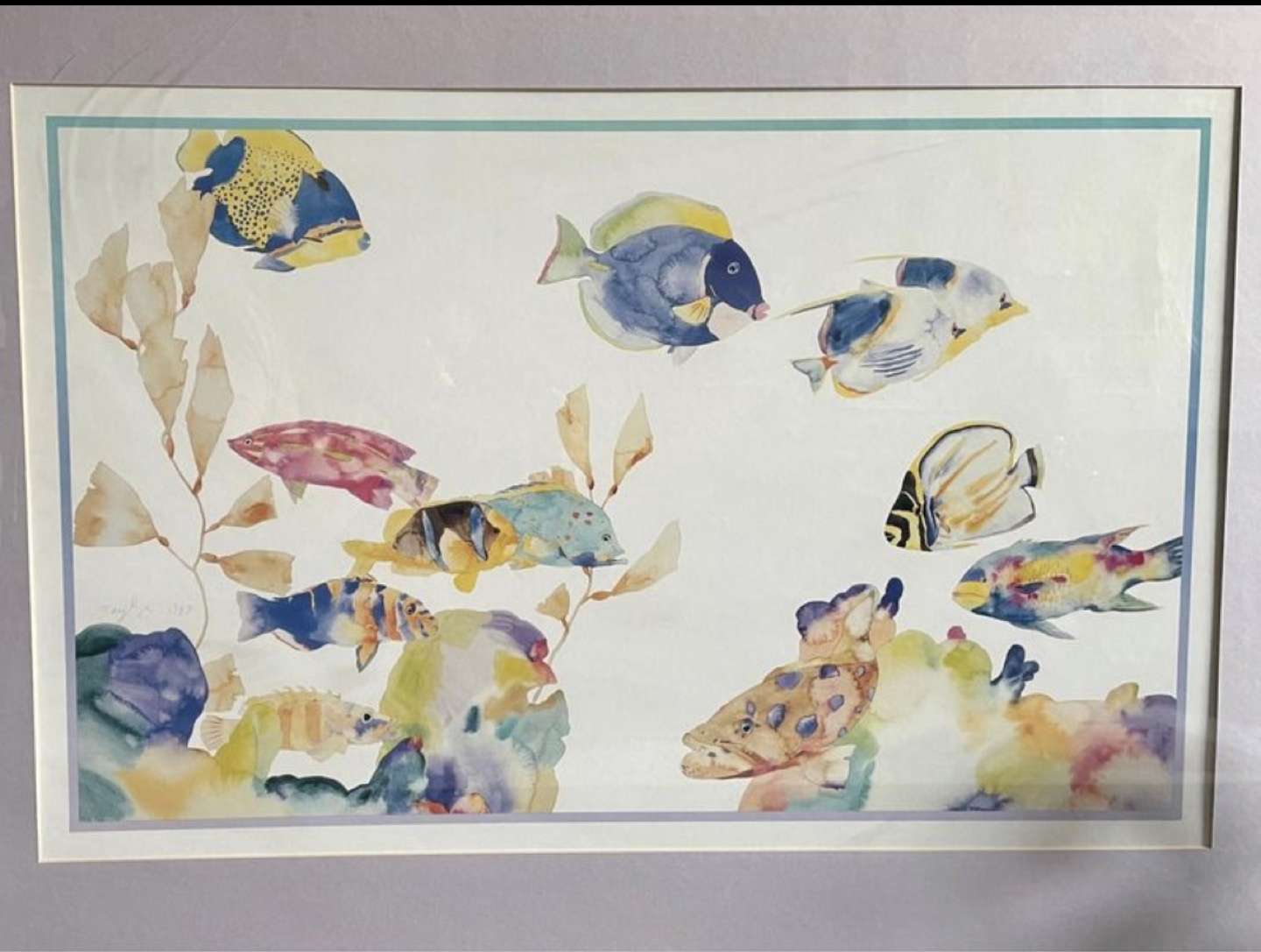 Striking vintage large fish art print by Tracy Taylor, dated 1987, vibrant and luminous, whimsy and fun! 27” x 38” Pick up around Sherbourne/ Wellesley Downtown delivery available ✅
