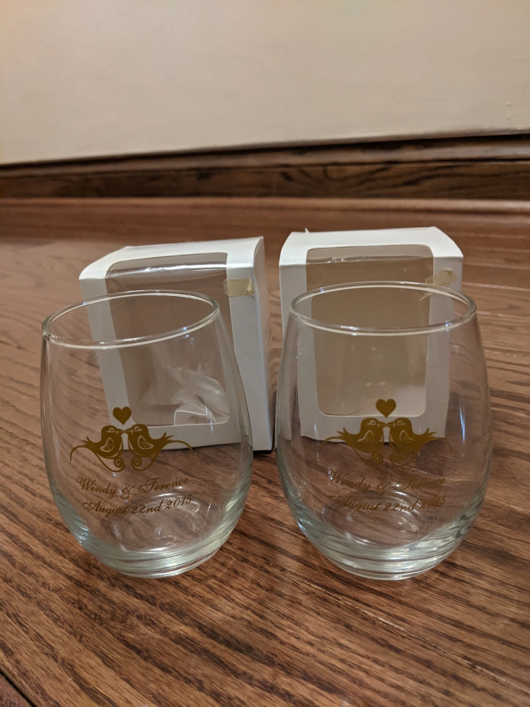 Two stemless wine glasses with gold bird design. Personalized with names and date.