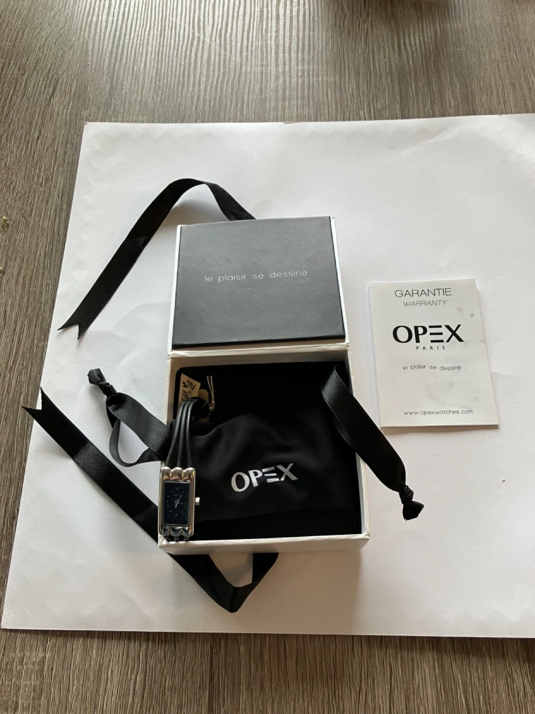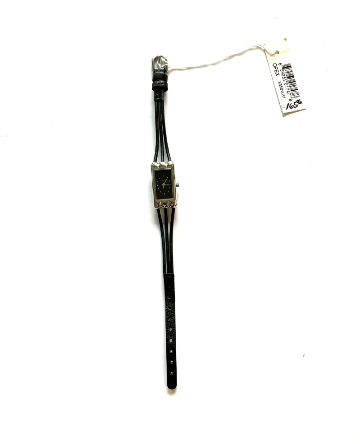 New OPEX women watch black leather band, silver face rectangular shaped. Comes with box, dust bag. Battery needs replacement. Good for gifting or personal use! *PLEASE CHECK OTHER LISTING BY ERIC *QUALITY AND BARGAIN ITEMS MIGHT INTERESTED YOU Thank you ๐ค