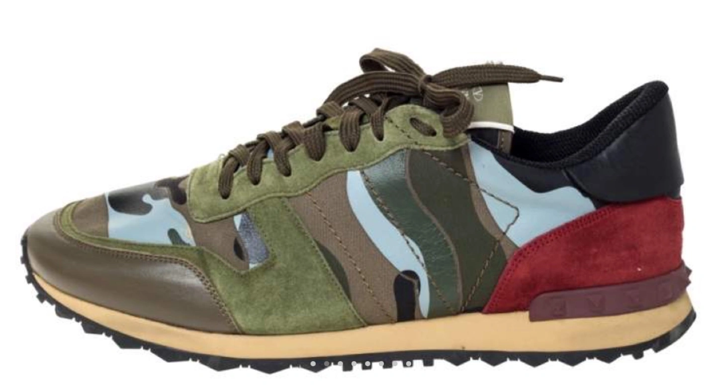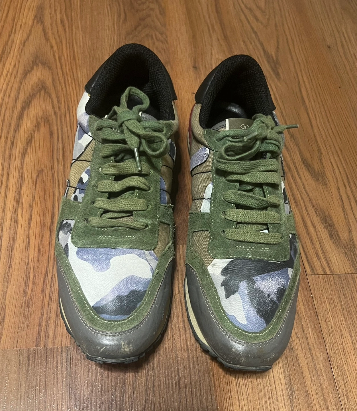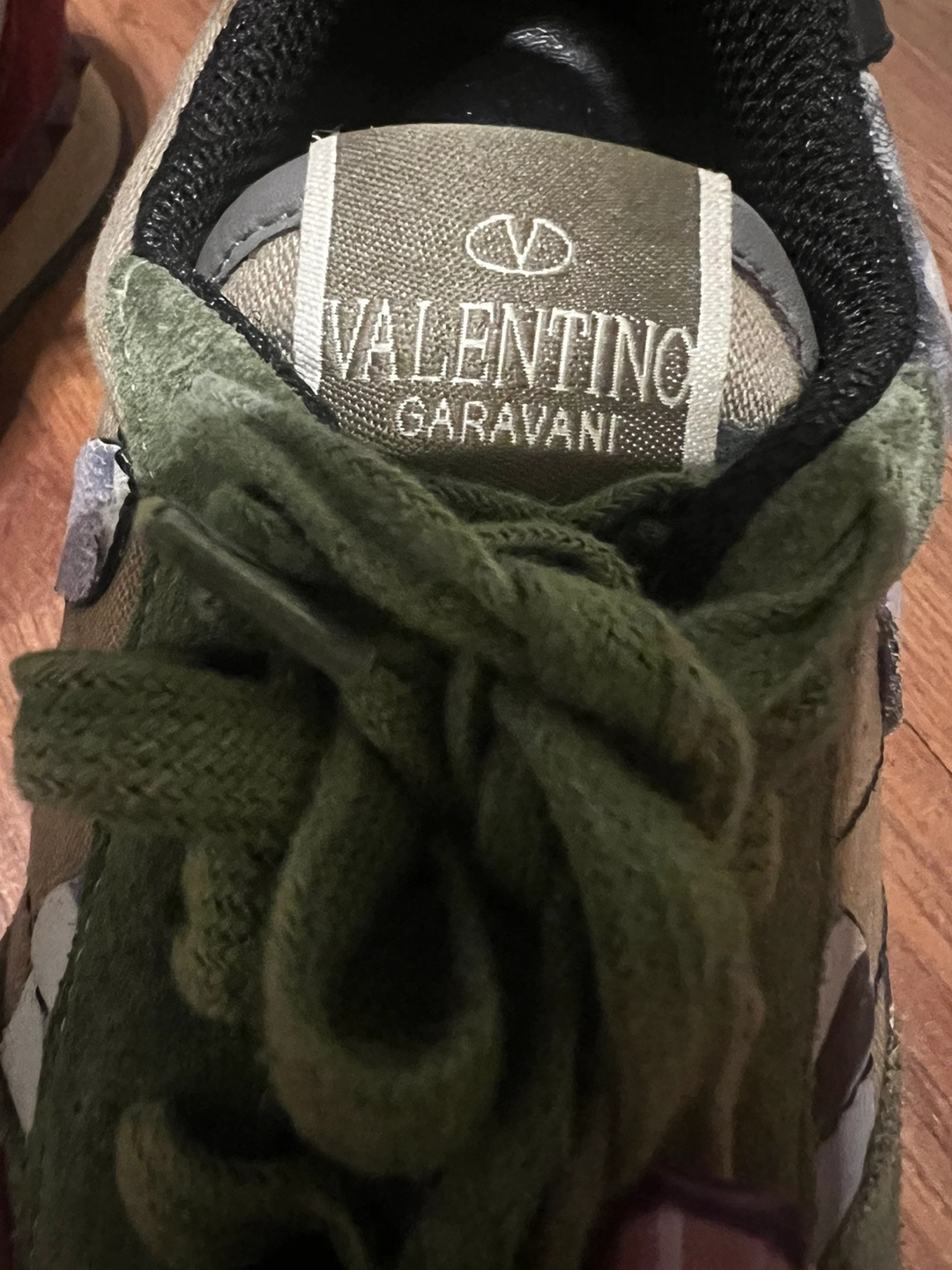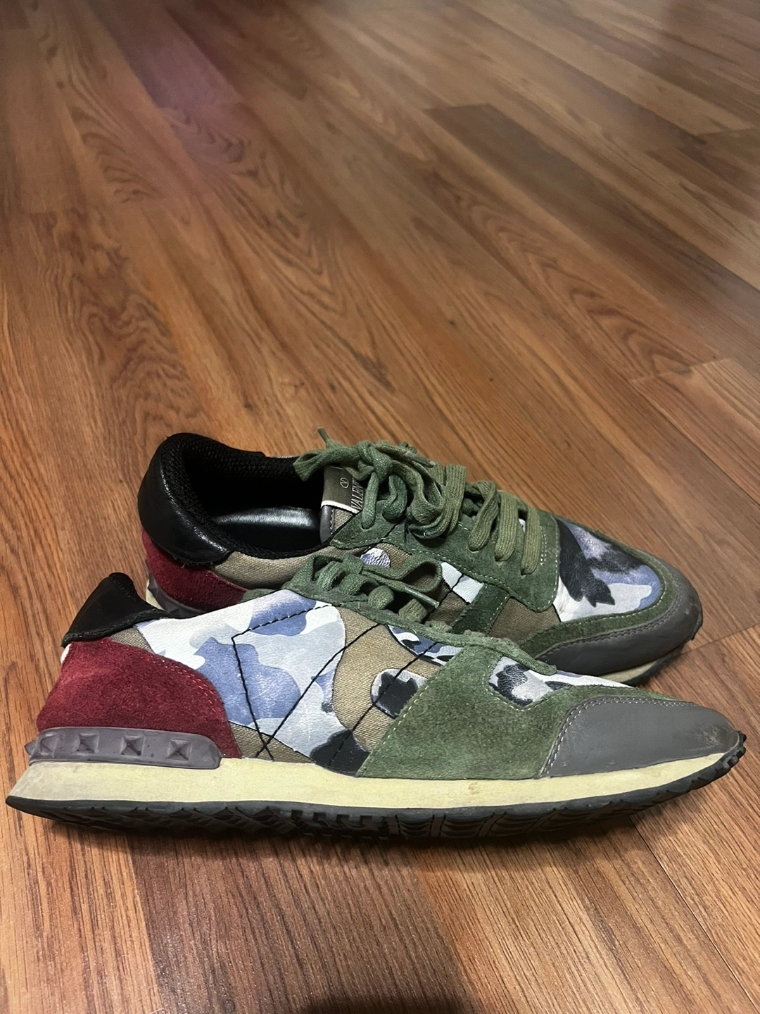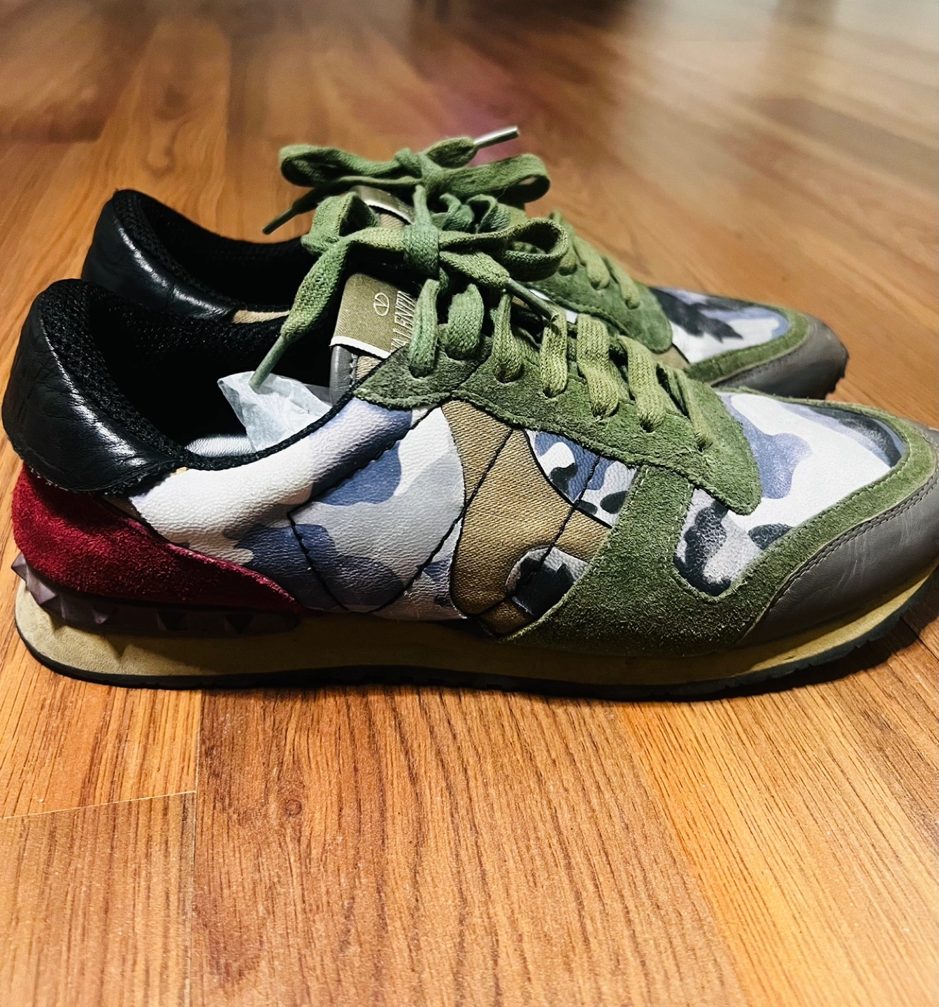 Camouflage sneakers in green, blue and red. Material: Leather and Suede Condition: 8/10 signs of wear on front Please see other listings for tons of great deals. Negotiations and bundles are welcome. ๐ Serious buyers only Will not respond to โ is this available?โ Pet/smoke free home. ๐ซ Meet up area flexible if near 401 and west GTA area๐ Tags: designer, authentic, Valentino Rockstar, trainers