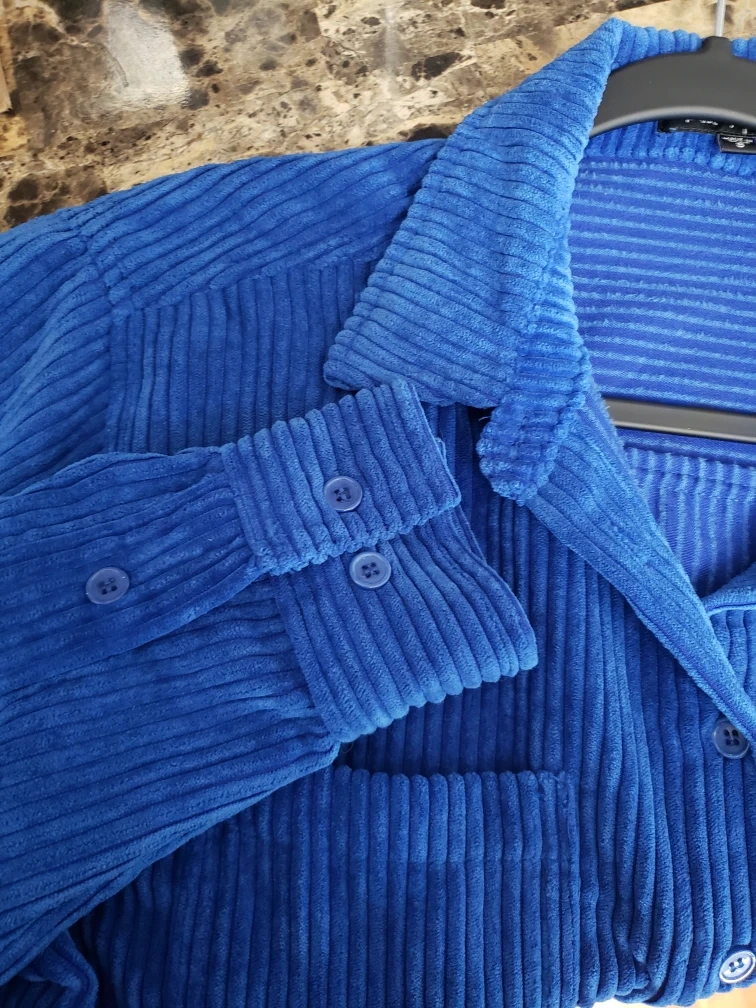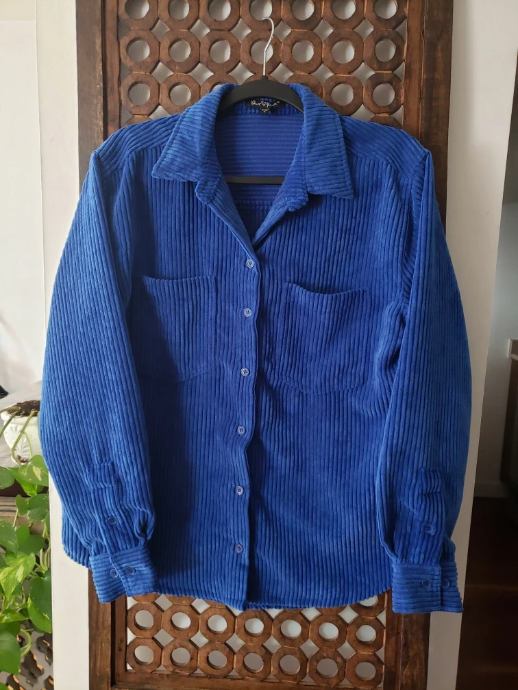 Beautiful royal blue corduroy button up shirt with two chest pockets and adjustable sleeves.