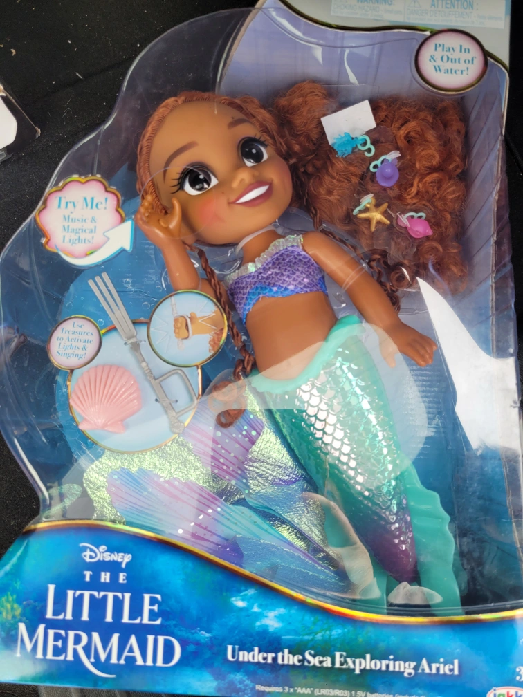 FROM DISNEY’S THE LITTLE MERMAID: This gorgeous Under the Sea Exploring Ariel doll features film details including Ariel’s beautiful hairstyle, fabric top and iridescent tail with flowing fins! LIGHTS, PHRASES, AND MUSIC: Ariel speaks and sings her signature song “Part of Your World” as her tail lights up! TWO MODES OF PLAY: Ariel can be played with in and out of water! Take Ariel on an under the sea adventure or set out to discover hidden treasures, just like in the film! INCLUDES CHARMS: Style Ariel’s hair with the included charms! Includes: 1 Doll, 1 Dinglehopper, 1 Seashell, 4 Hair Clip Charms - Suggested for ages 3+