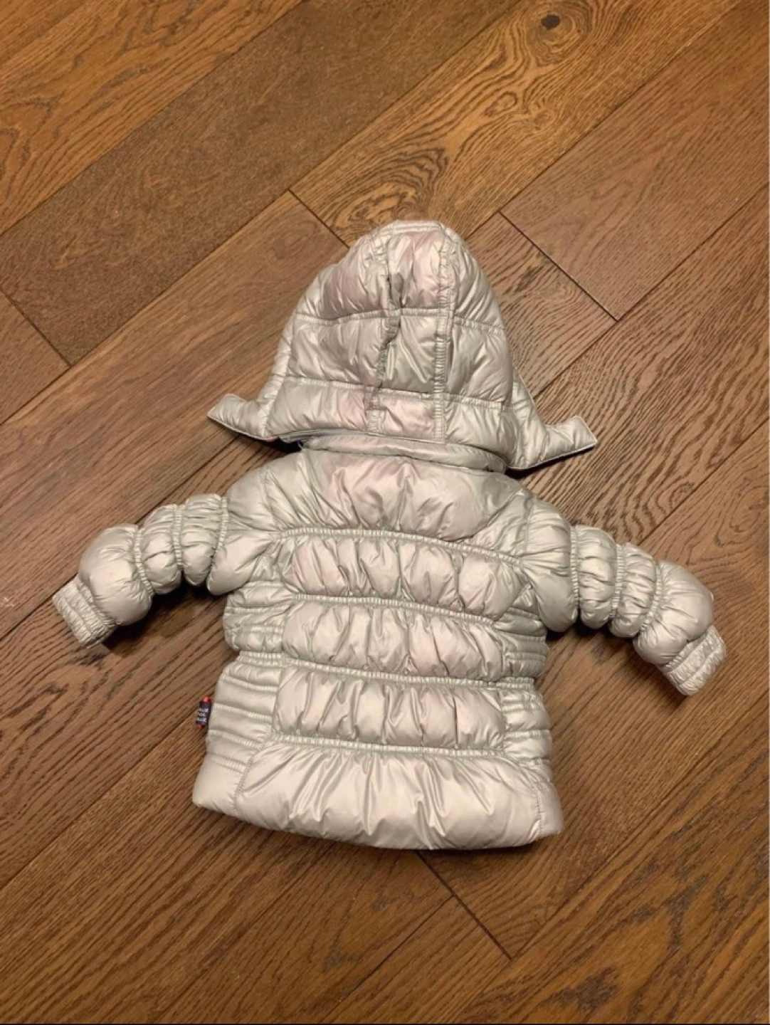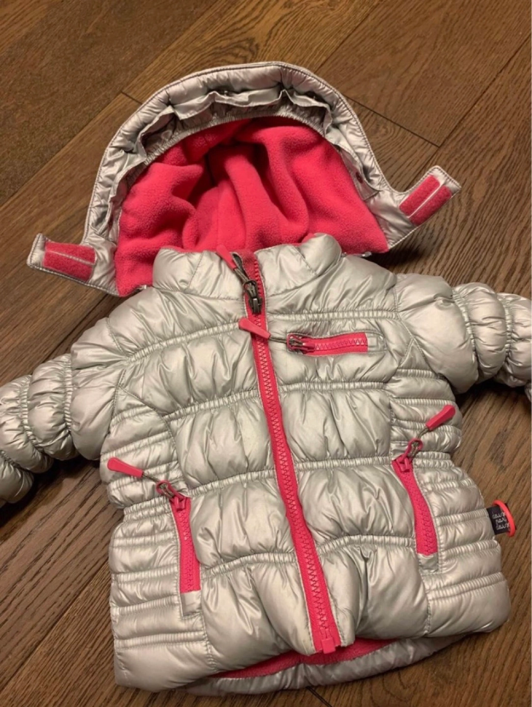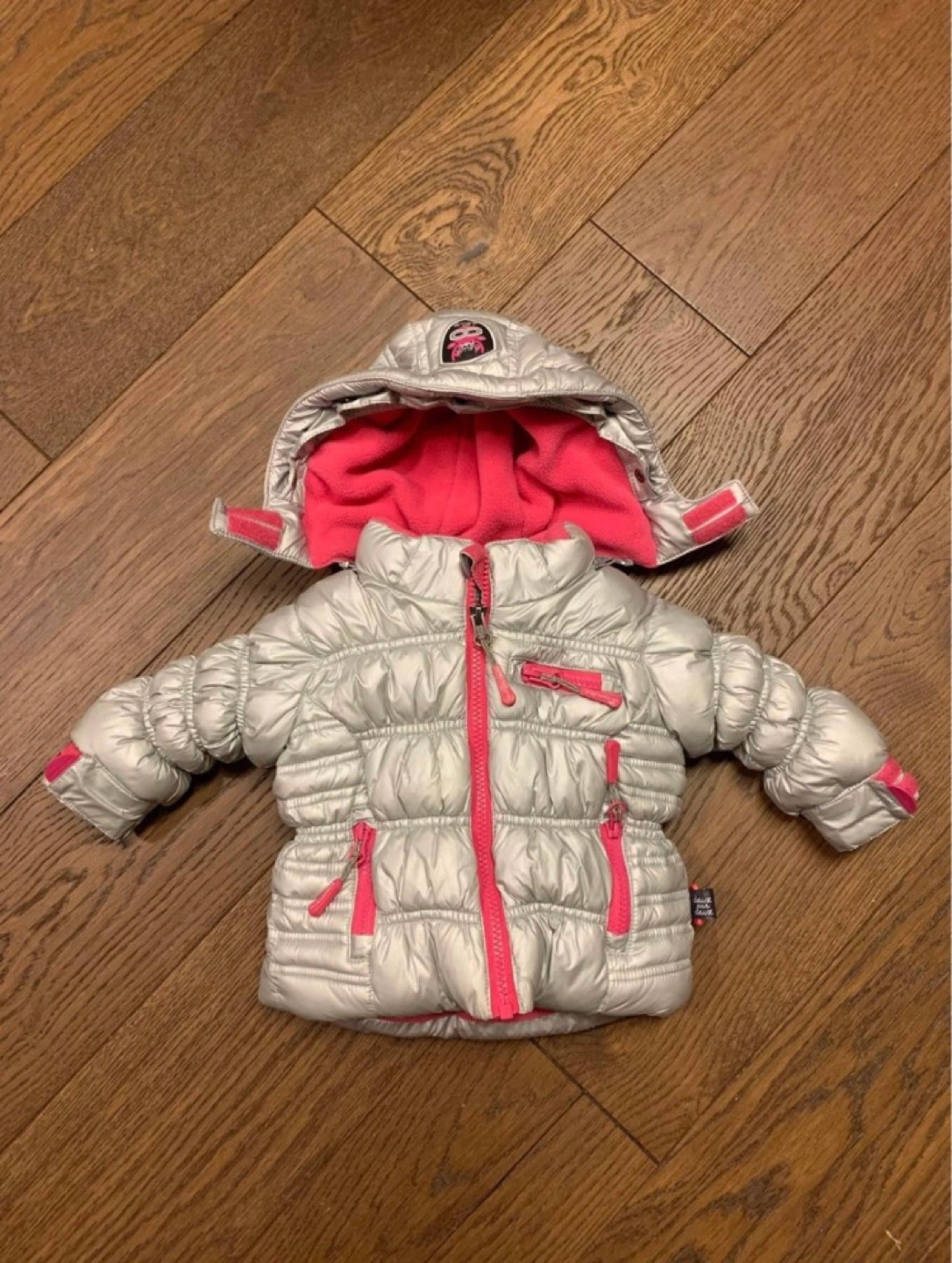 Silver puffer jacket with pink lining. Zipper closure and two pockets. Has a hood. This is new just washed, but never worn. Size 6months Pickup in Millwoods. Cash only for payment.