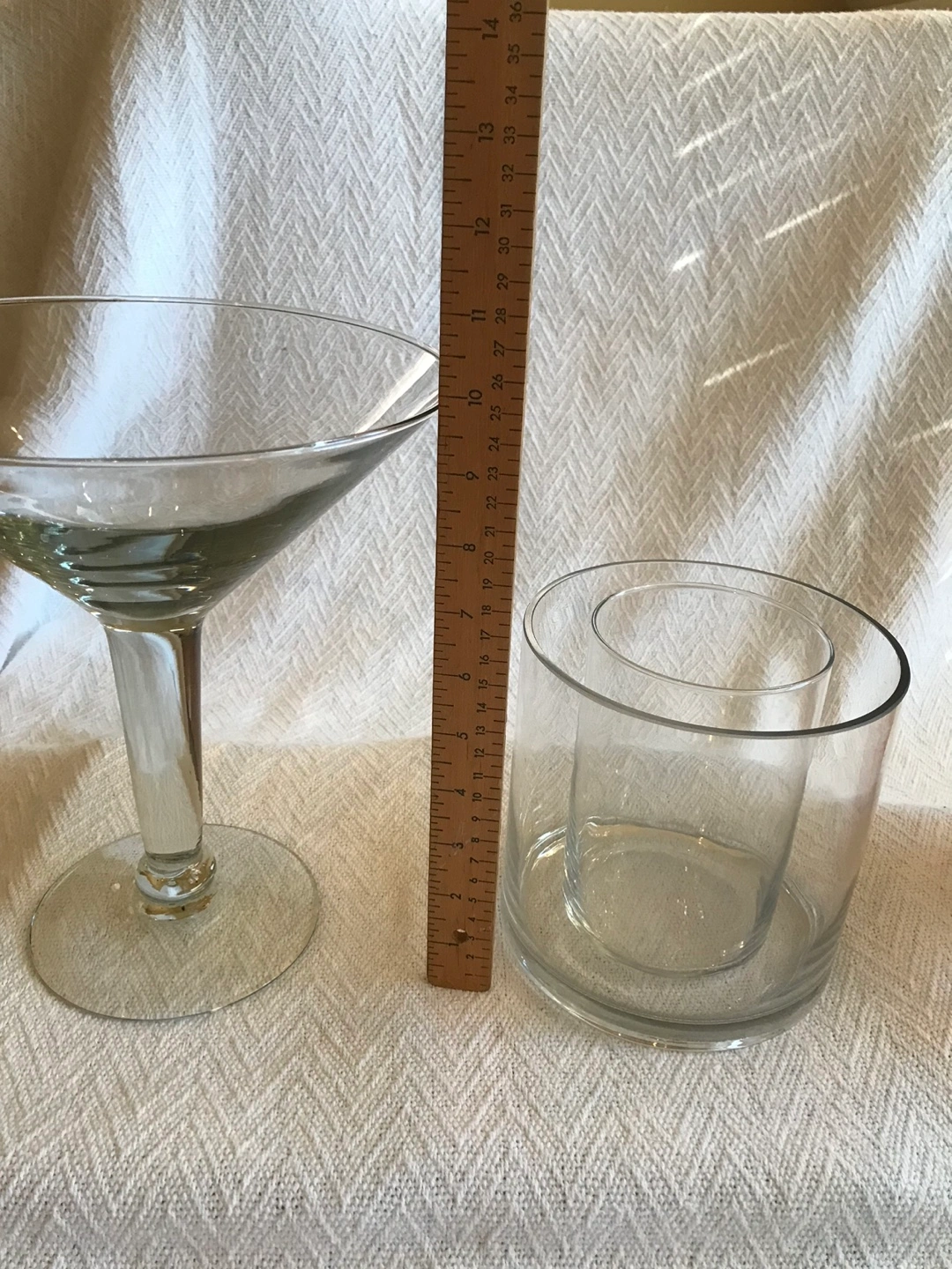 Tall, clear jumbo glass martini glass. Perfect for serving cocktails, snacks, or even as a vase. Purchased for a large event. Excellent for wedding candy bars, drinks, group appetizers/desserts, floral arrangements, centrepieces etc. I have a case for sale