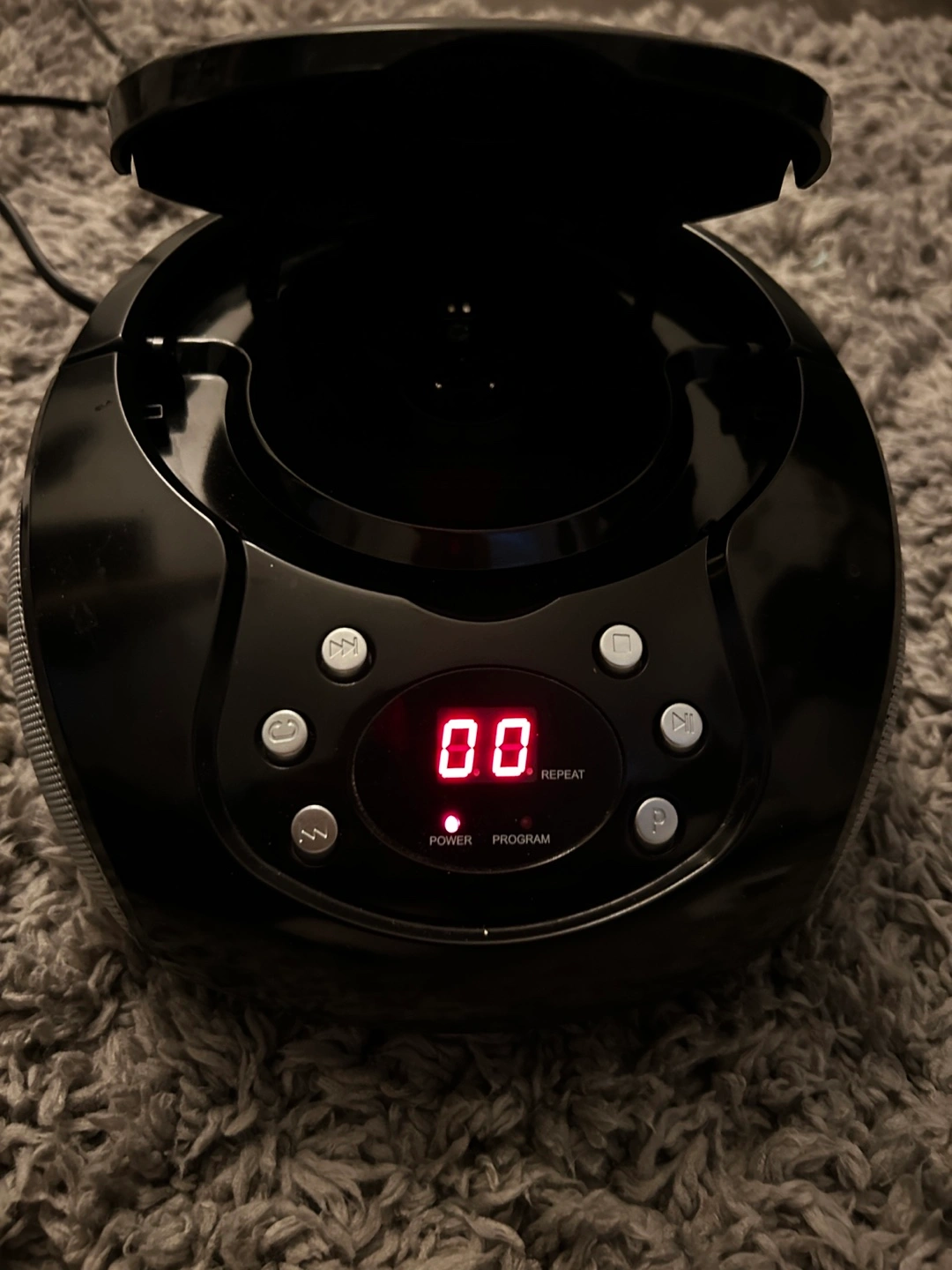 Black CD player with a digital display. Includes manual and power cable. Plays music from CDs and has a built-in speaker.