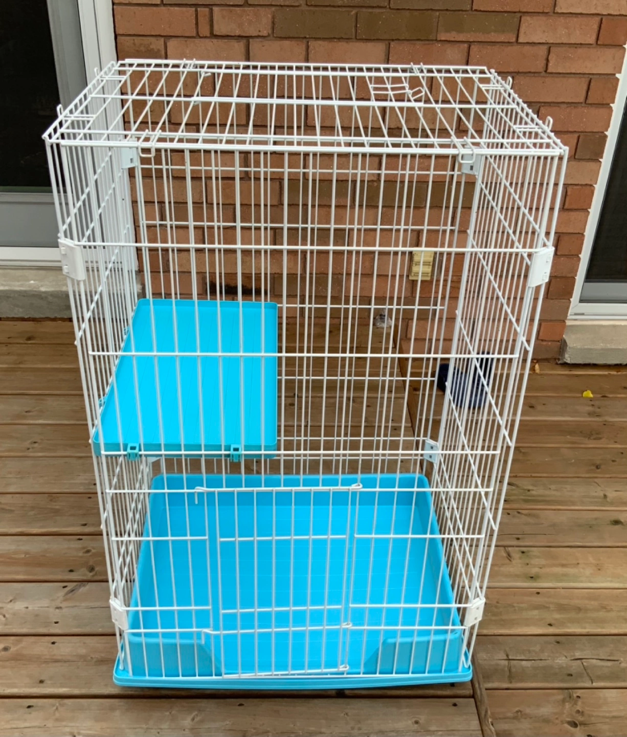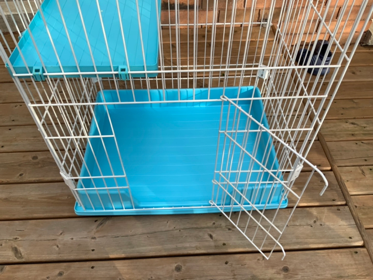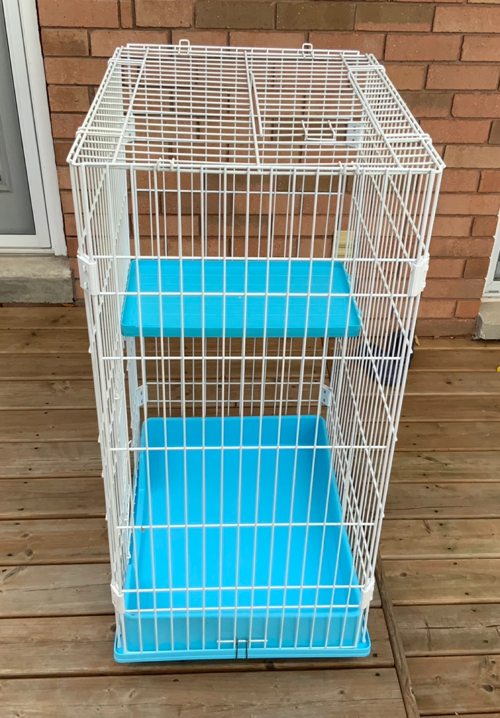 Wire cat cage/ Play Pen White powder coated wire Sturdy plastic base with easy rolling coasters Front and top access doors Knockdown design for easy transport and storage 26 inches long by 19 1/2 inches wide Stands 42 inches high Inside height 39 inches Used twice and in good condition