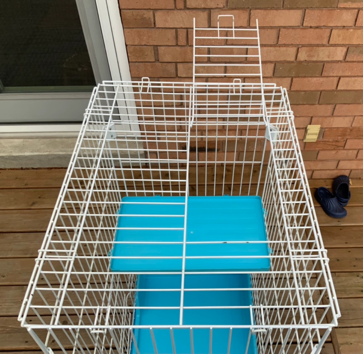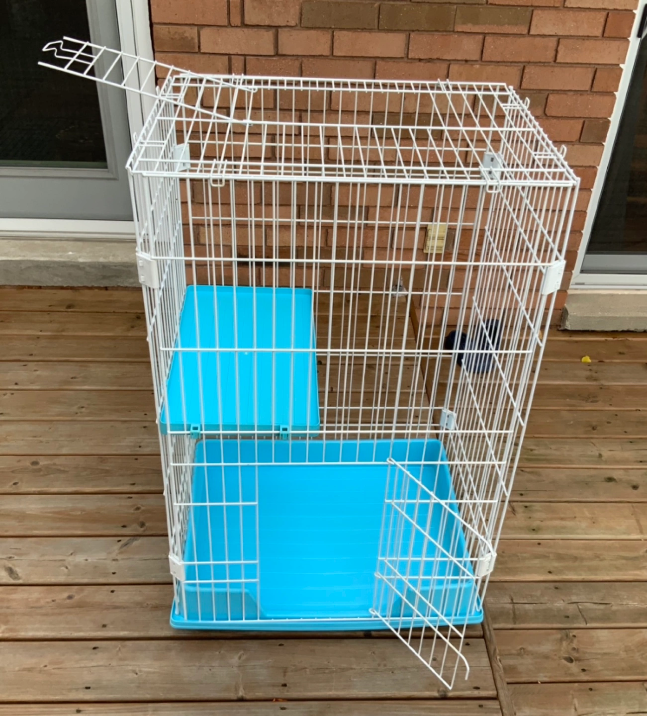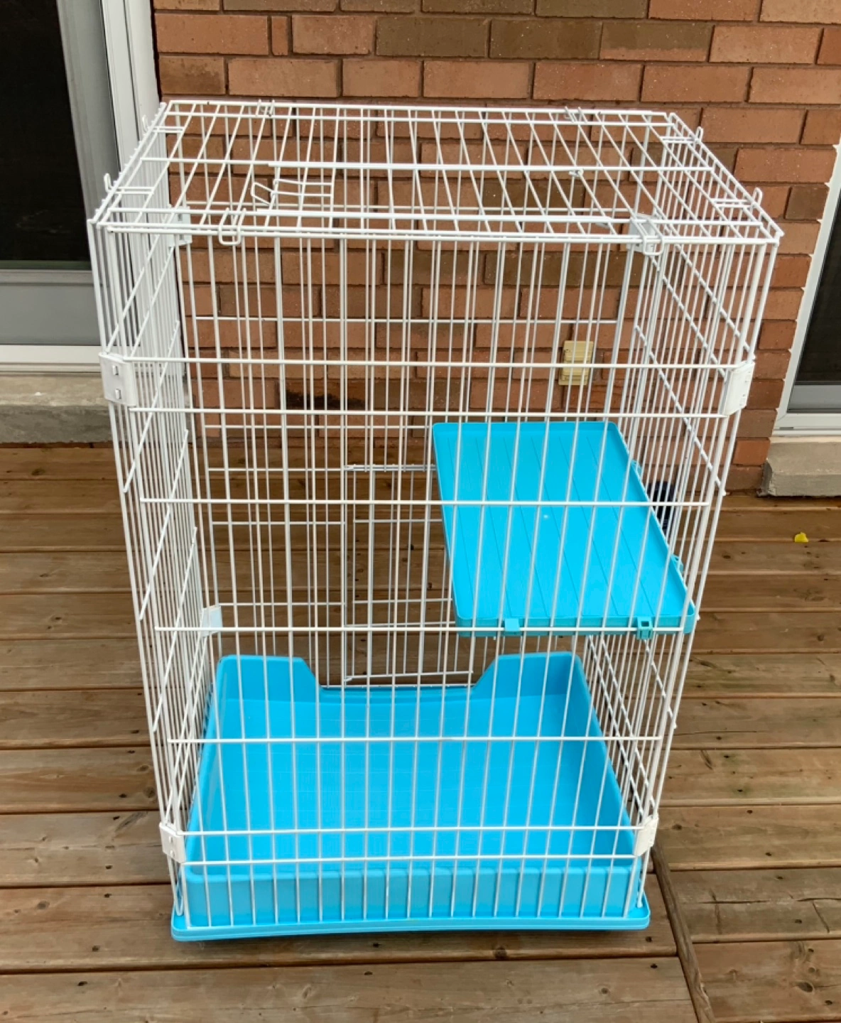 Wire cat cage/ Play Pen White powder coated wire Sturdy plastic base with easy rolling coasters Front and top access doors Knockdown design for easy transport and storage 26 inches long by 19 1/2 inches wide Stands 42 inches high Inside height 39 inches Used twice and in good condition