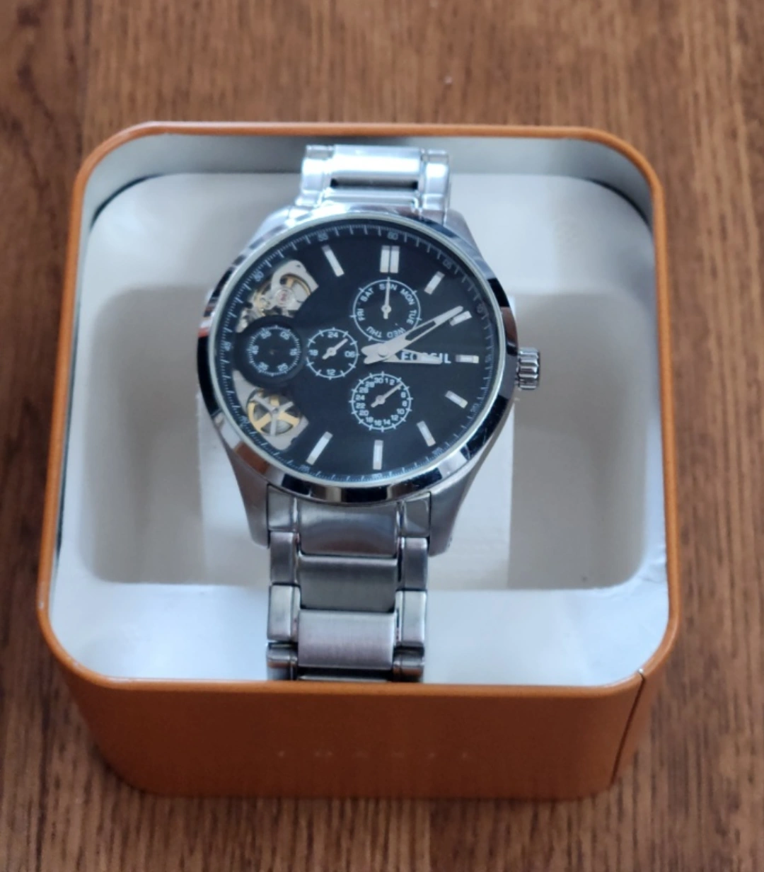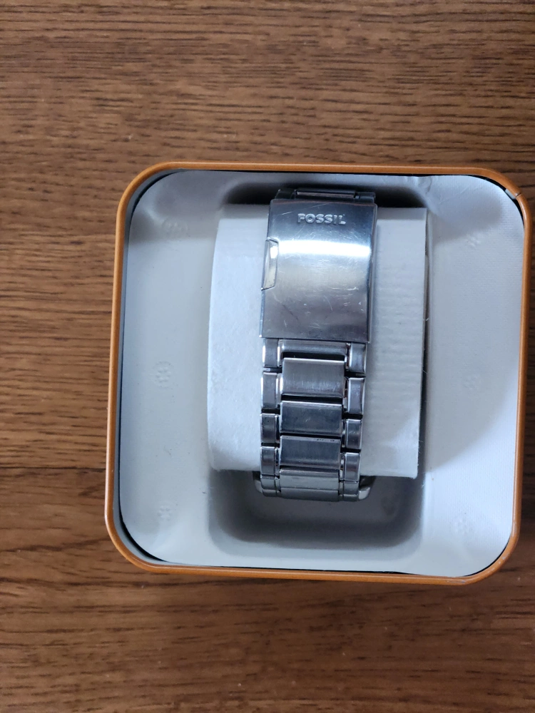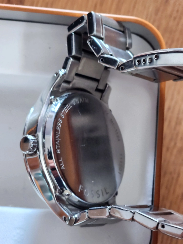 Men's Fossil Watch! This one is a looker! For sure! Model: ME1124 5ATM All Stainless Steel Working Condition, Just needs a new battery! If you've had problems getting a battery replacement for this type of watch, I will give you proper instruction to do it yourself or to give instruction to your battery replacement specialist! Usually, a good watch smith shouldn't have a problem with replacing the battery on this one! Disinfected with cleaning alcohol for your confidence!