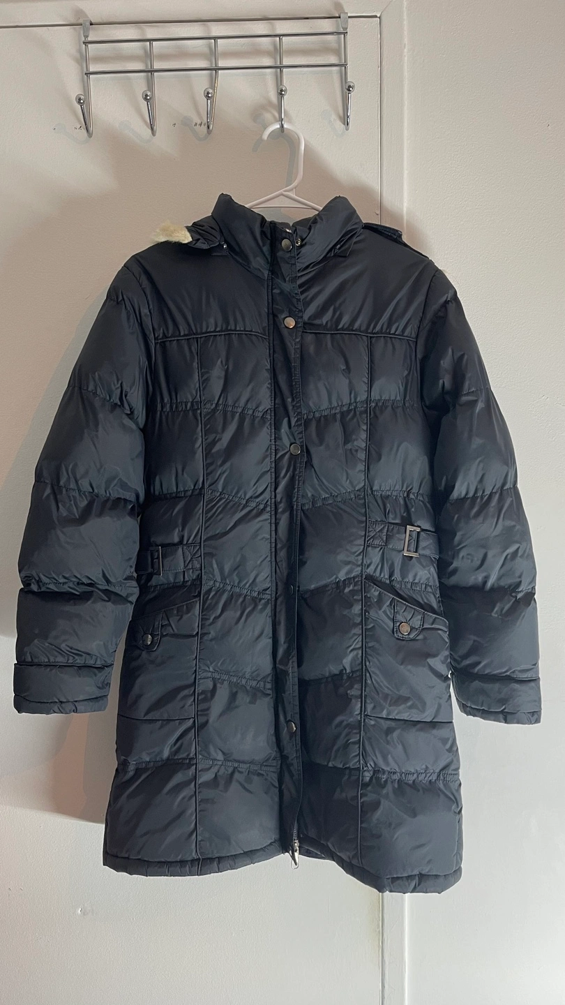 Dark blue puffer jacket with faux fur hood and a zipper closure. It’s super warm! Size: small/medium (I’d say it’s more like a large small size which works as medium) Pick up: 1145 Logan avenue