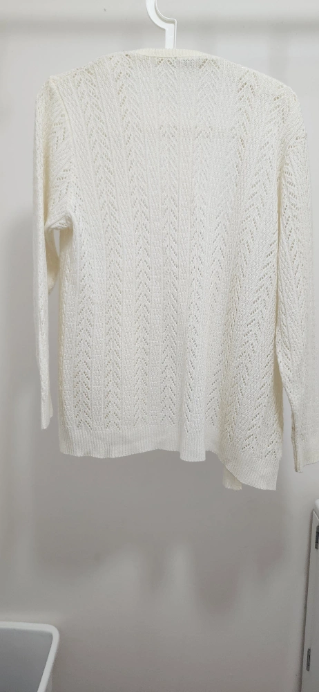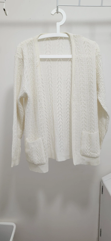 White knit cardigan with long sleeves, open front and two pockets Length: 27" Shoulder width: 18" Sleeves: 23" 100% Acrylique Made in Canada