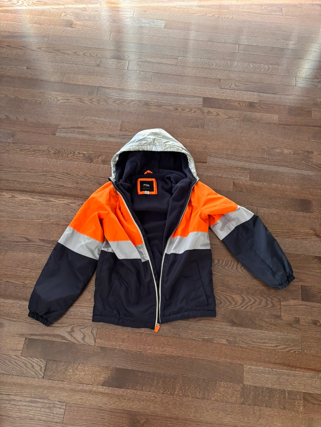 Kids' jacket with a zipper closure and a hood. It has orange, white, and blue colour blocking. It is lightly padded. Size 12 Available in Barrhaven from a smoke free and pet free home.