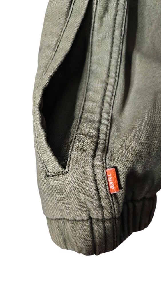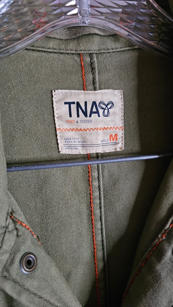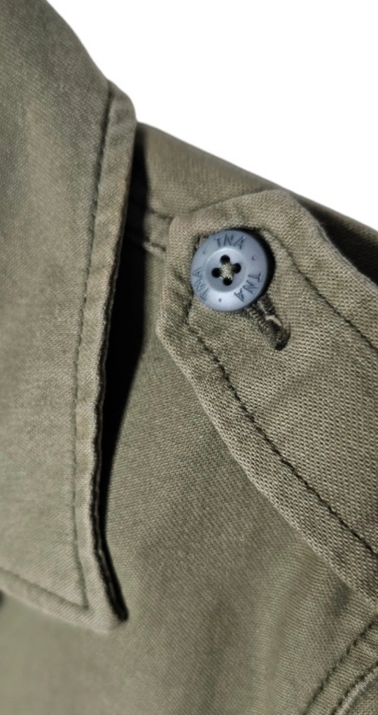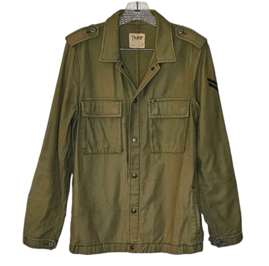 *** PICK-UP AT BROADVIEW & DANFORTH AREA *** Long-sleeved green utility jacket with button closure and flap pockets. Has a button-up collar and a single patch pocket on the left sleeve. Spare button included. Measurements, materials, and care instructions are shown in my photos. My home is pet-free and smoke-free.