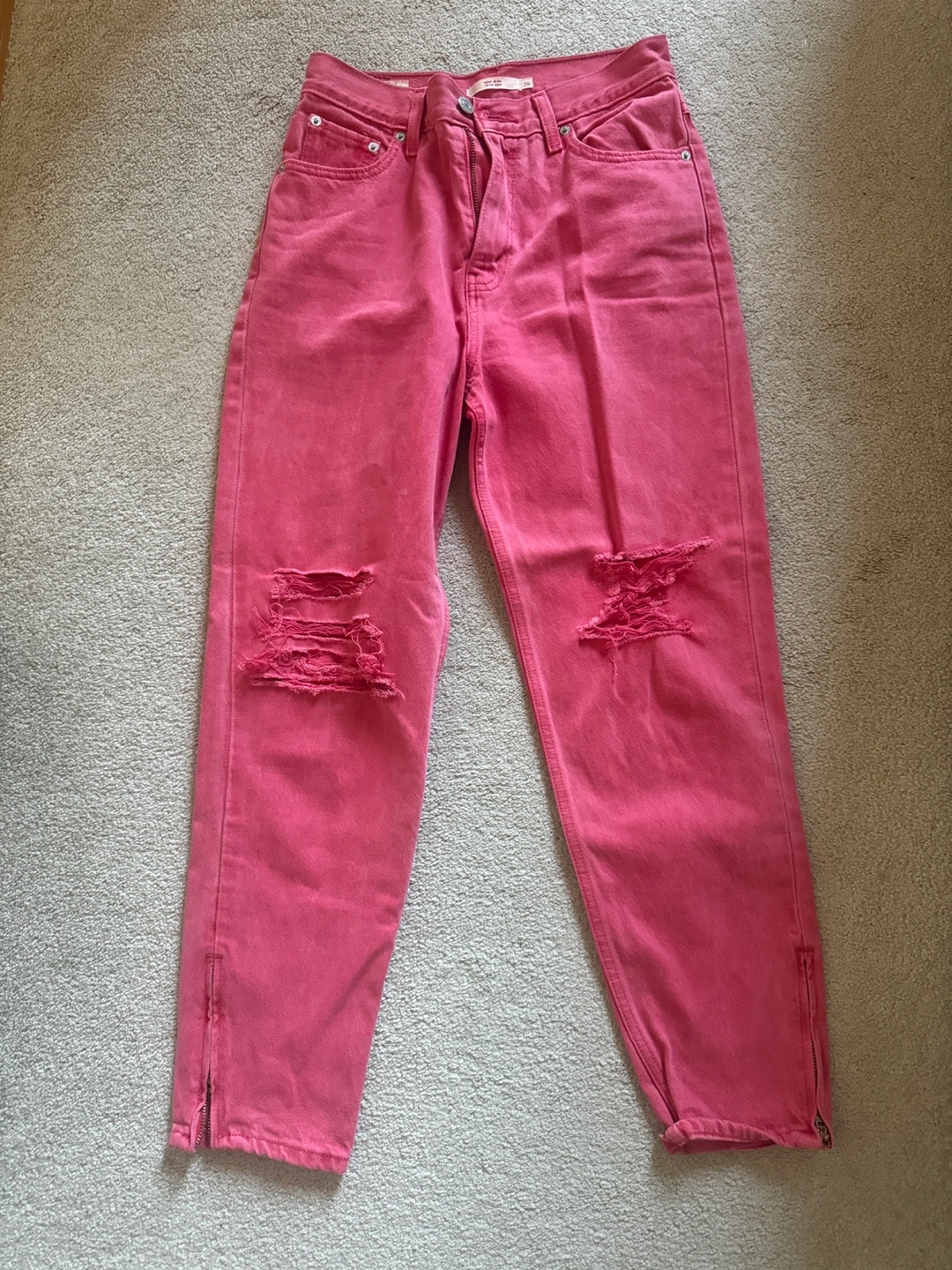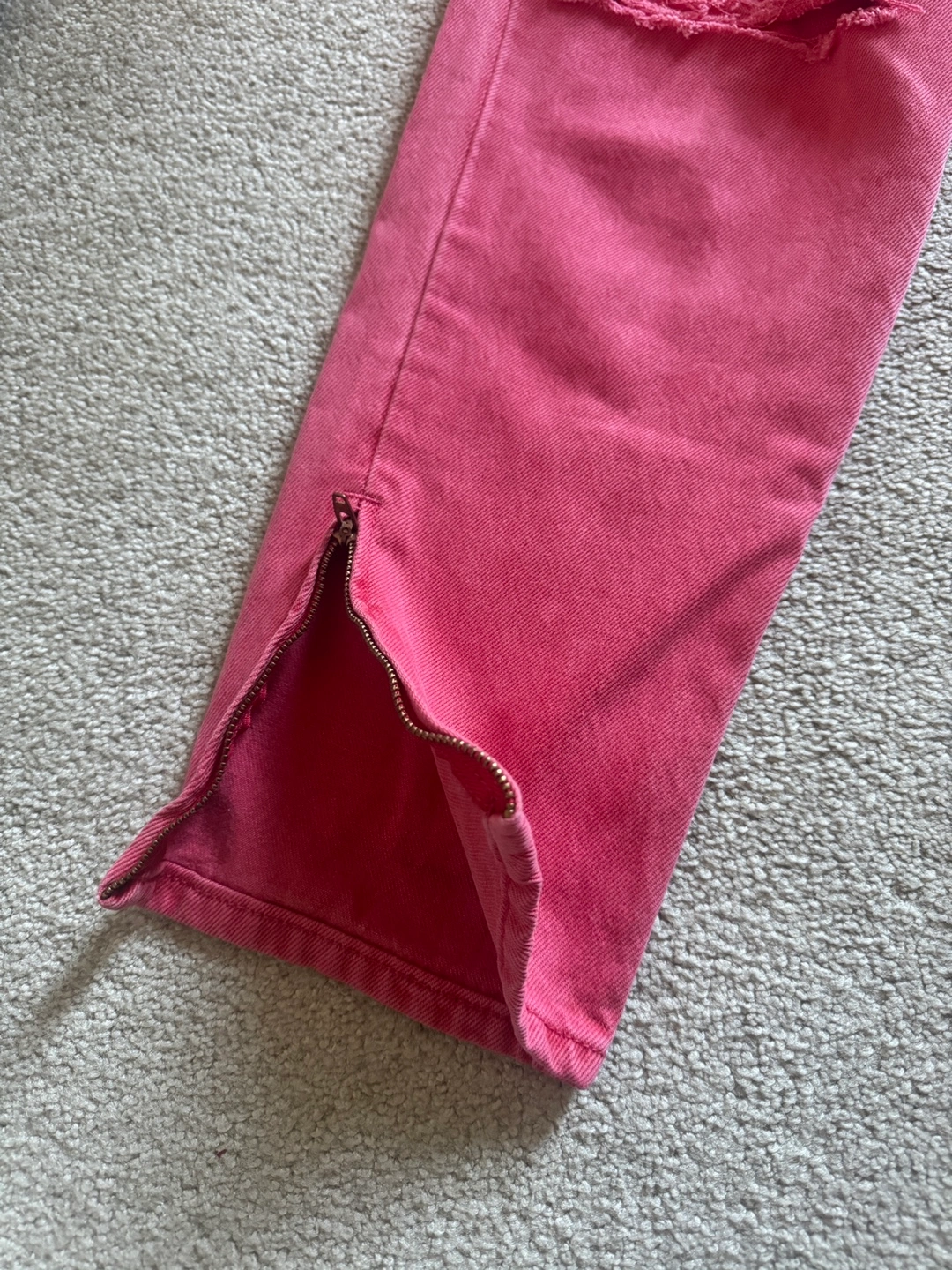 High waisted mom jeans with distressing and side zippers. Pink colour.