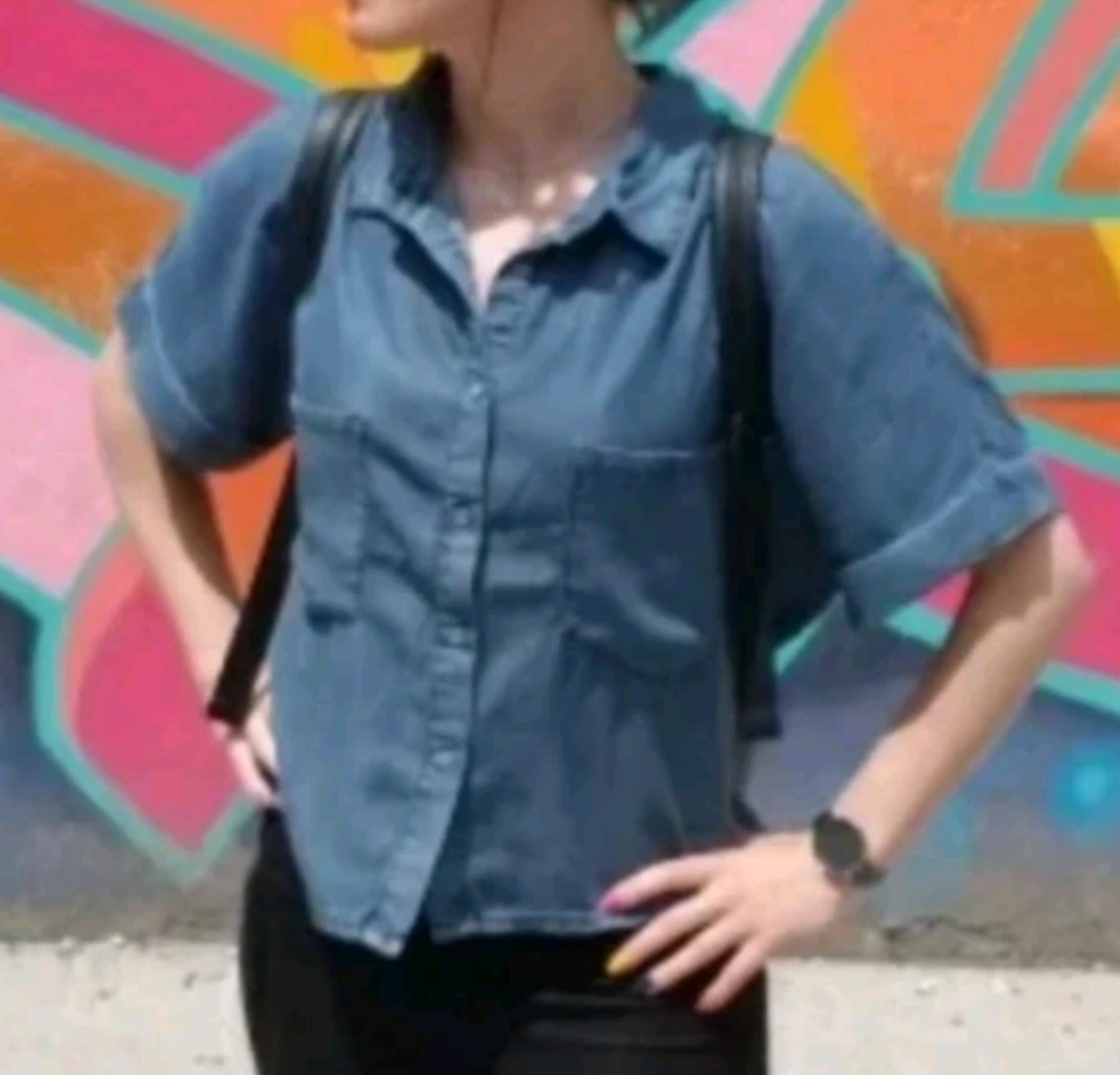 Short rolled sleeve button up jean shirt. Cropped fit. Two front pockets.