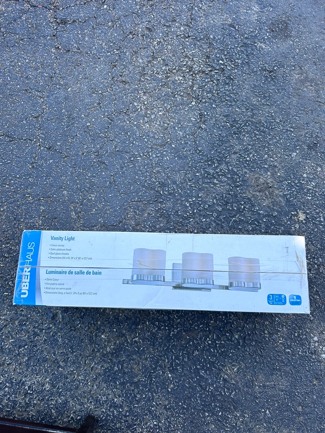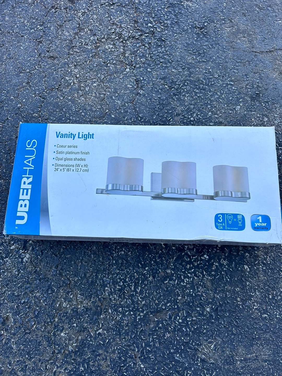 Satin platinum finish, opal glass shades. 3-Light. Brand new, never used, unopened.