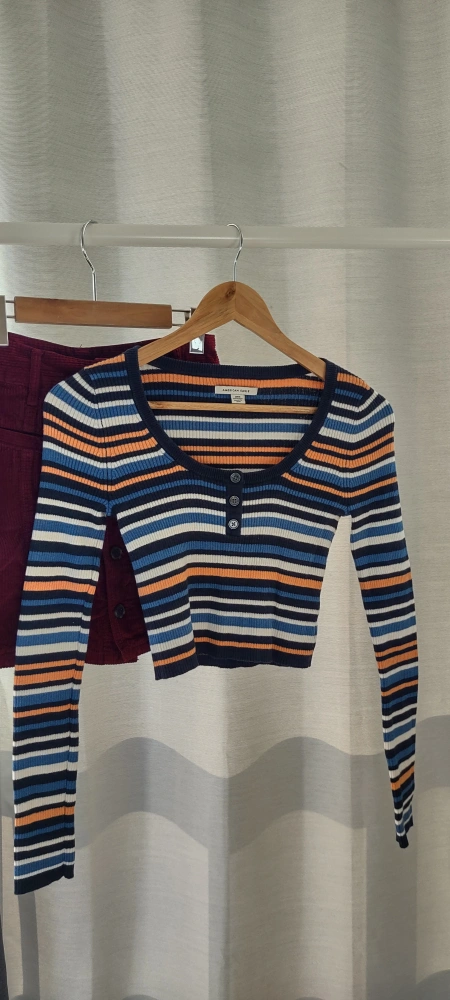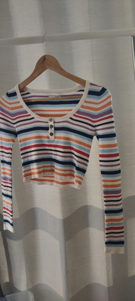 Long-sleeved, striped crop top with a button-up detail. Made of a soft, stretchy fabric. I have two color. each price
