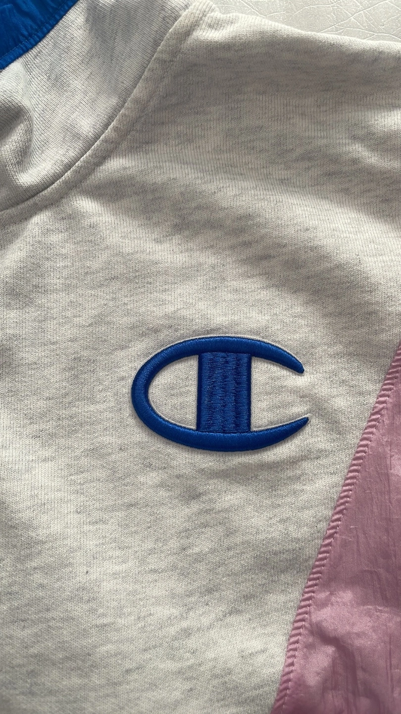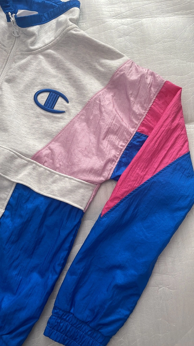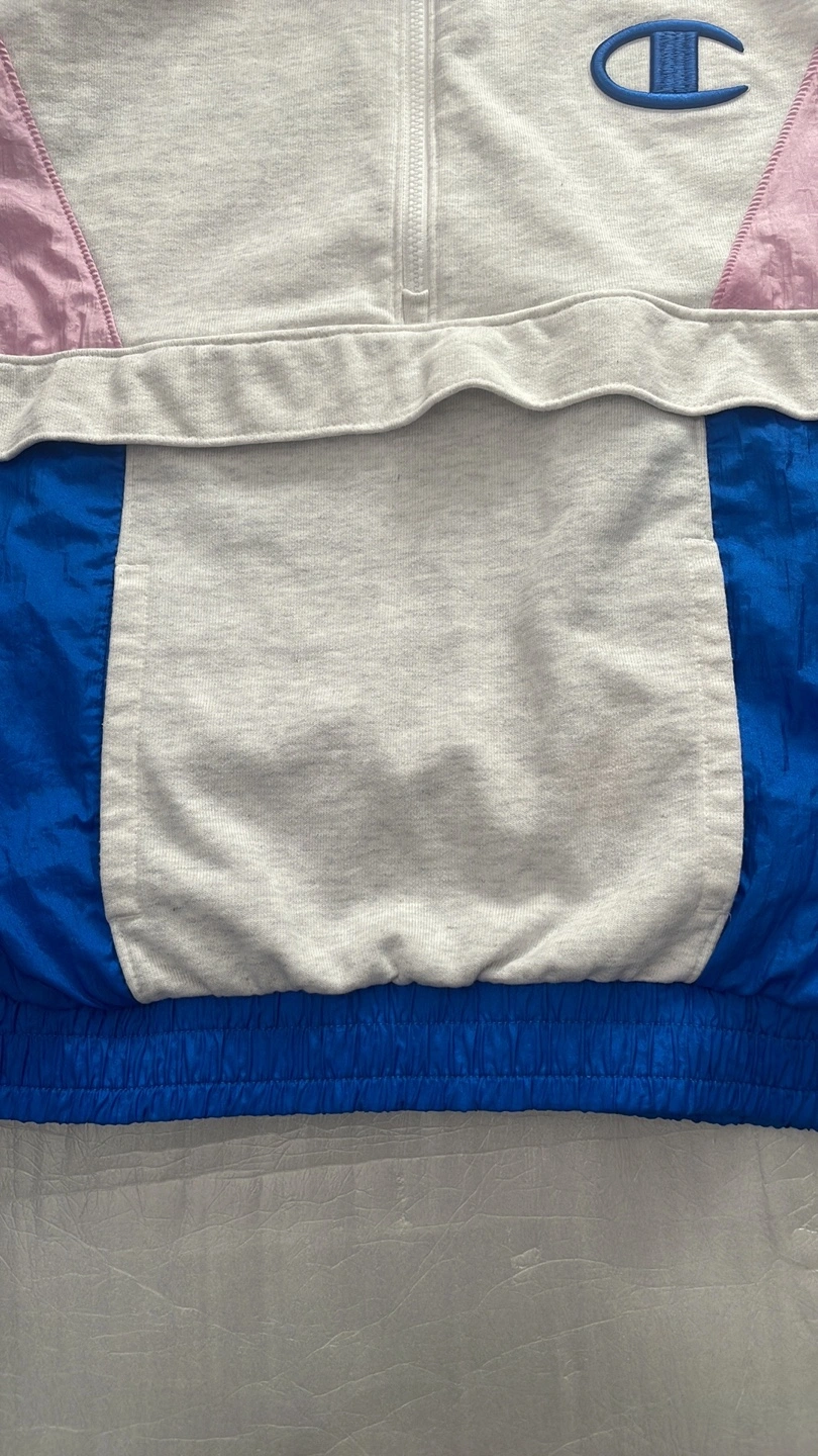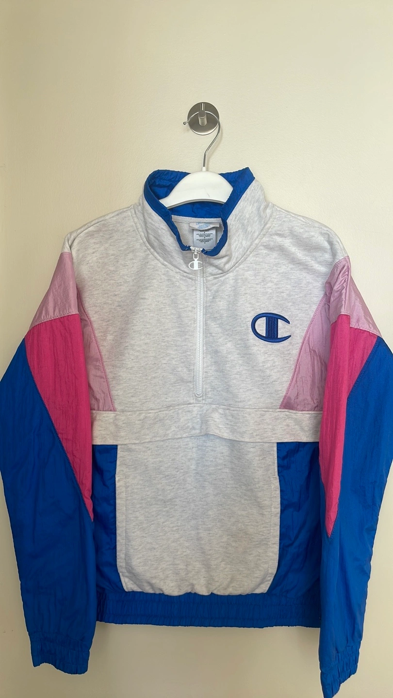 CHAMPION COLOUR BLOCK ZIP UP JACKET (Medium size) PICKUP LOCATION: Scarborough Town Centre Mall only PRODUCT INFO.: ***Condition: 9/10. Almost new! Has been worn once or twice. No rips or stains. Closet clear out. ***Has a very attractive grey, pink and blue colour block design in almost a neon colour scheme! ***Kangaroo pouch pocket ***Zipper closing (until midway) ***Brand logo design in white in the zipper handle ***Netted lining in the bottom half of the jacket for a comfortable wear ***Elastic cuff in the sleeves and bottom hem of the jacket for stretch and warmth in cool weather ***Cotton-Polyester ***Machine washable MEASUREMENTS: Length: 23” (shoulder to hem) Chest Width: 20” (approx.)