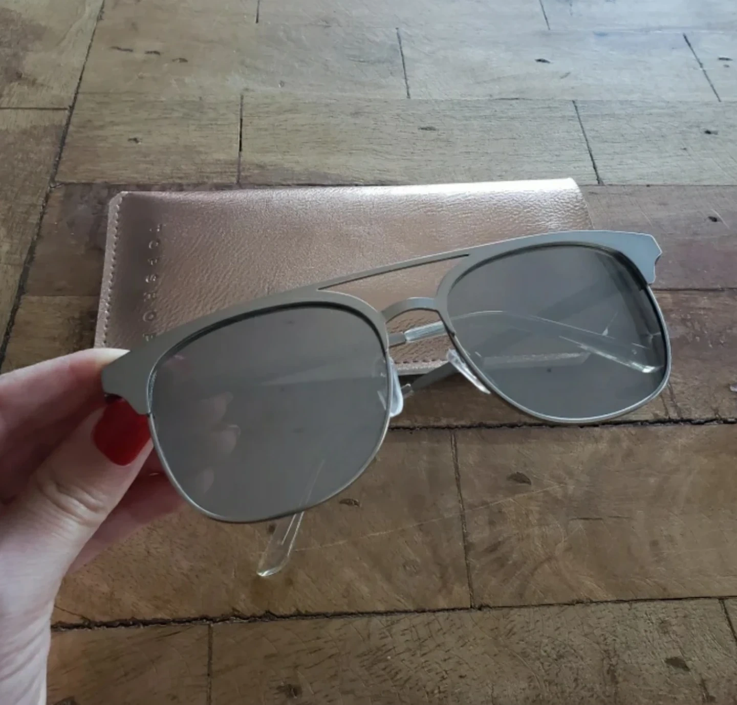 Silver sunglasses with a mirrored lens. Comes with a case.