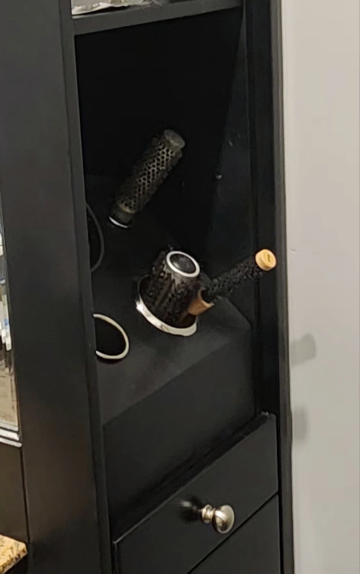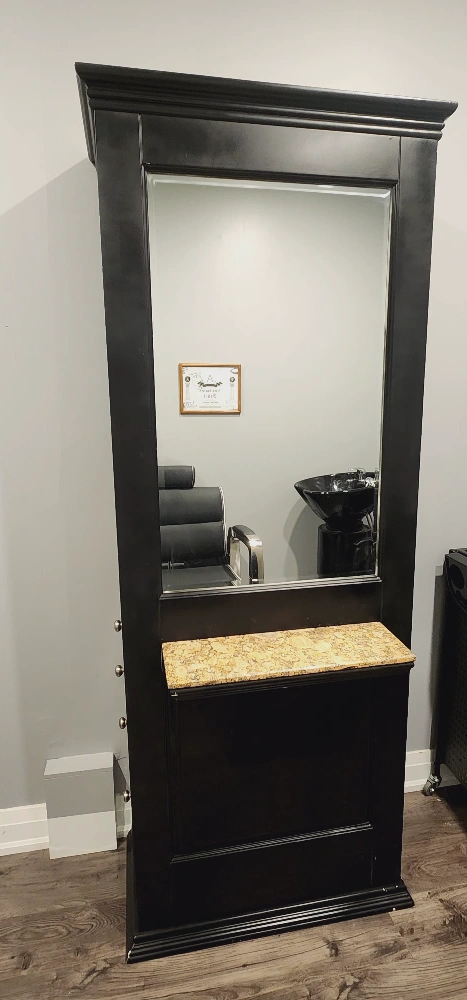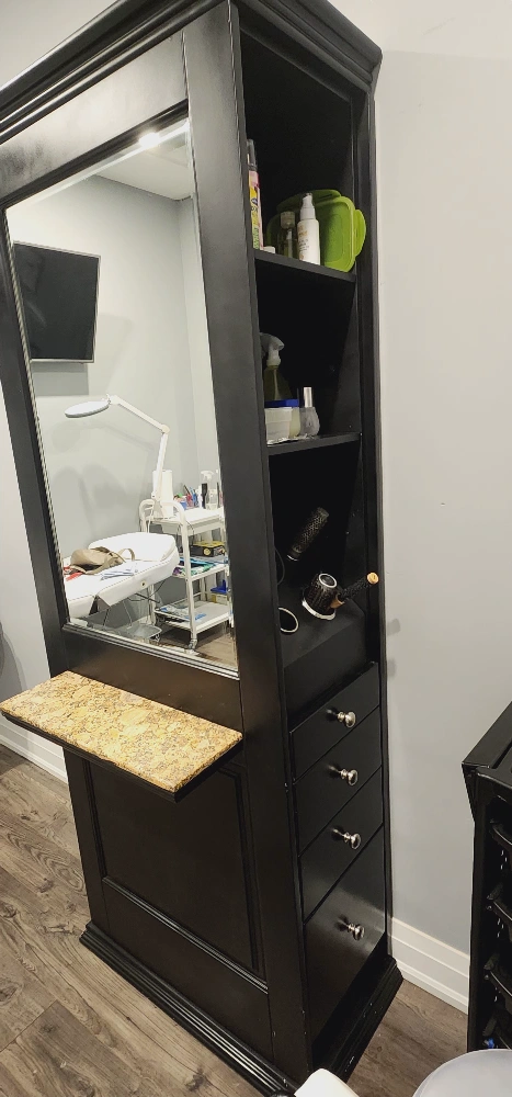Black salon styling station with a mirror, granite counter, and drawers. It has shelving and is in good condition. I bought it brand new 8 months ago. it has some chips but can't be seen or functional. pick up on 160 Wellington Street East, Aurora. please arrange a time to visit and pick up. only cash or e-transfer before pick up.