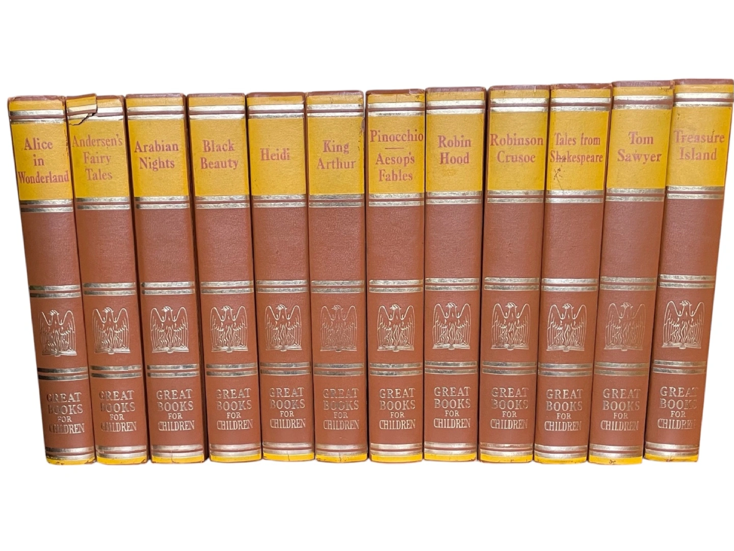 Mid-century set of 12 "Great Books for Children." Titles included: Alice in Wonderland Andersen's Fairy Tales Arabian Nights Black Beauty Heidi King Arthur Pinocchio & Aesop's Fables Robin Hood Robinson Crusoe Tales From Shakespeare Tom Sawyer Treasure Island To be picked up in the Yonge & Davisville area.