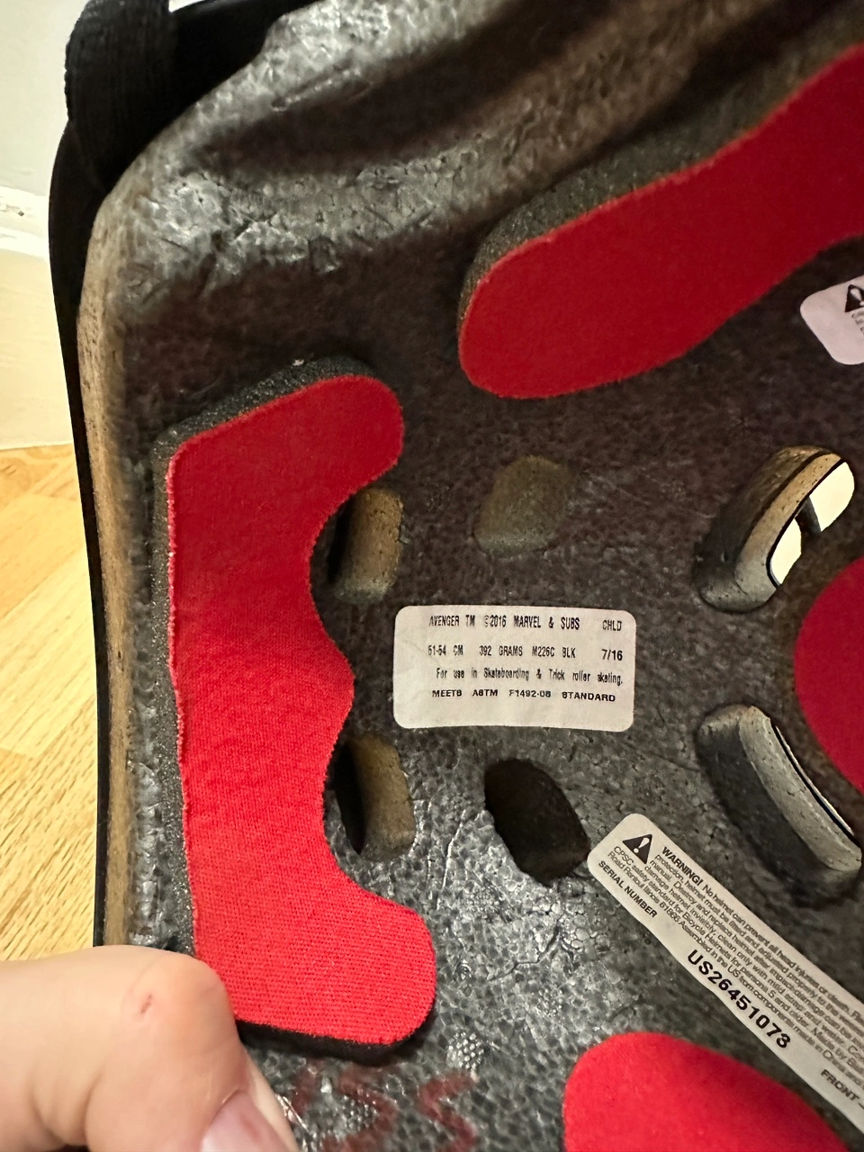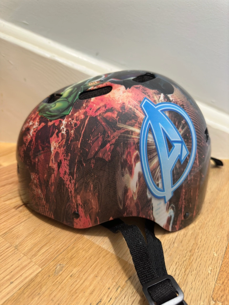 Child bike helmet with Avengers design. Black with red, yellow, and blue accents.