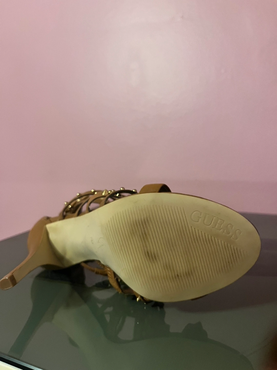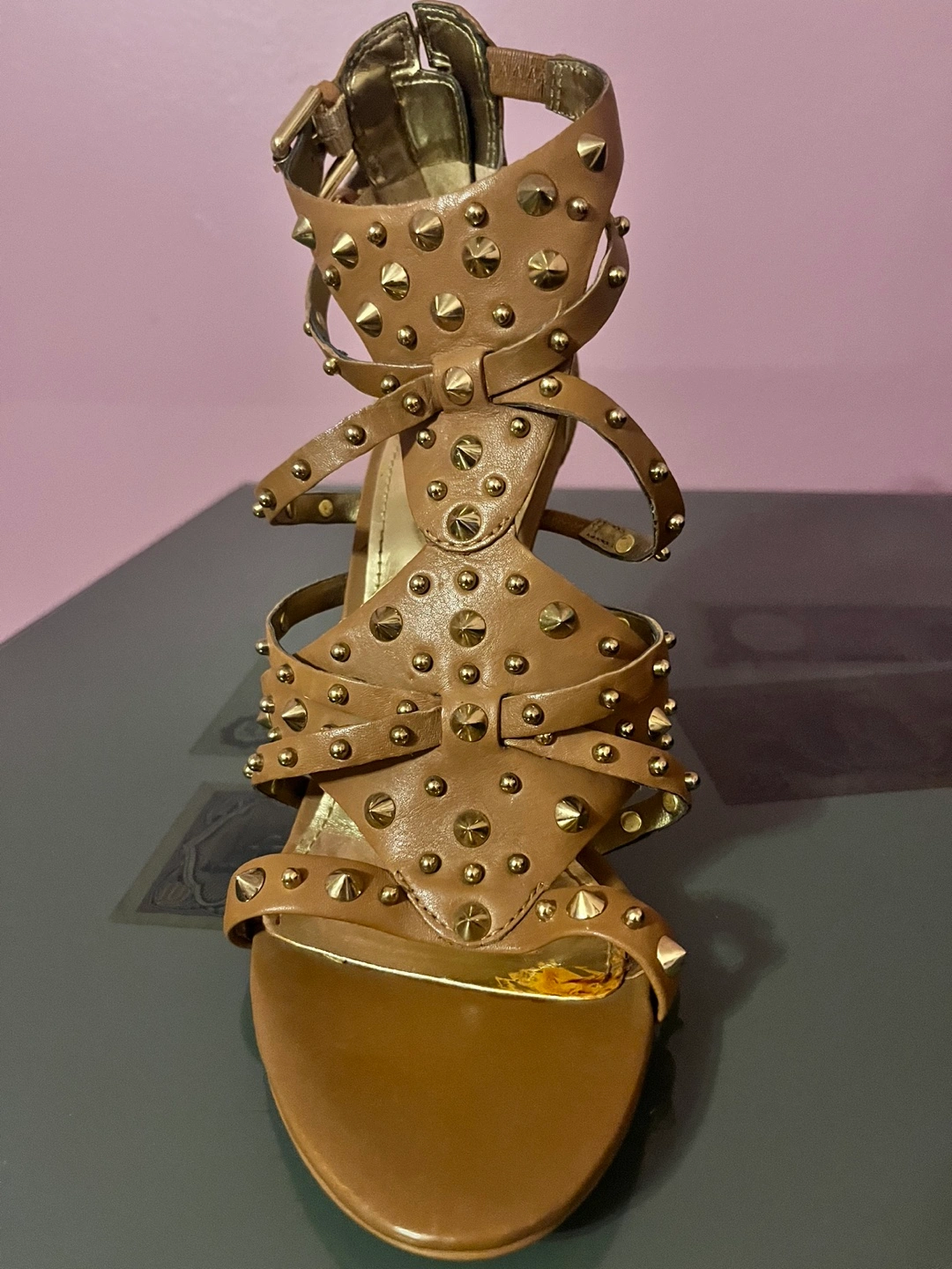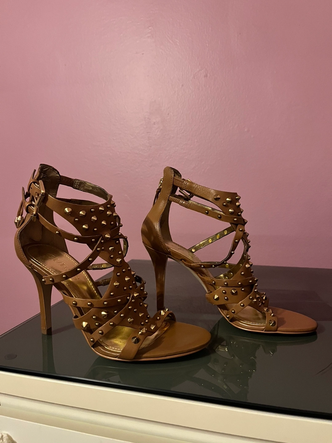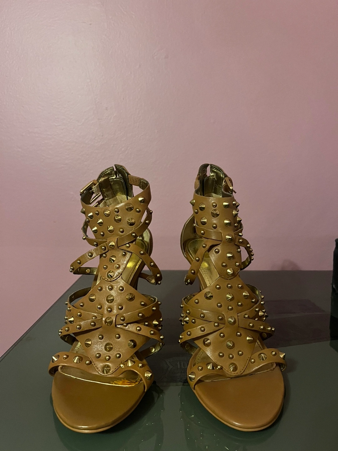 Brown leather upper studded stiletto heels, with gold accents, ankle strap and a back zip closure. In good condition, has been worn less than a few times. Open to offers. Cash preferred. Meet at Oldmill Subway Station or any station on the Green line. Serious buyers only! If you reschedule more than once or you stop responding to my messages, I will assume you are no longer interested in the item and move on to the next buyer.