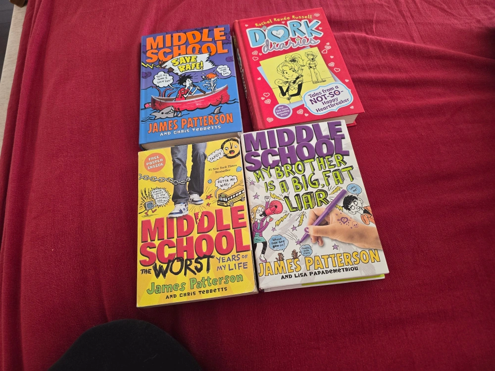 Set of four books from the Middle School book series by James Patterson, including Save Rafe, My Brother is a Big, Fat Liar, The Worst Years of My Life, and Dork Diaries. Some books have minor wear and tear, but all books are in good condition.$5 each. $15 for 4.