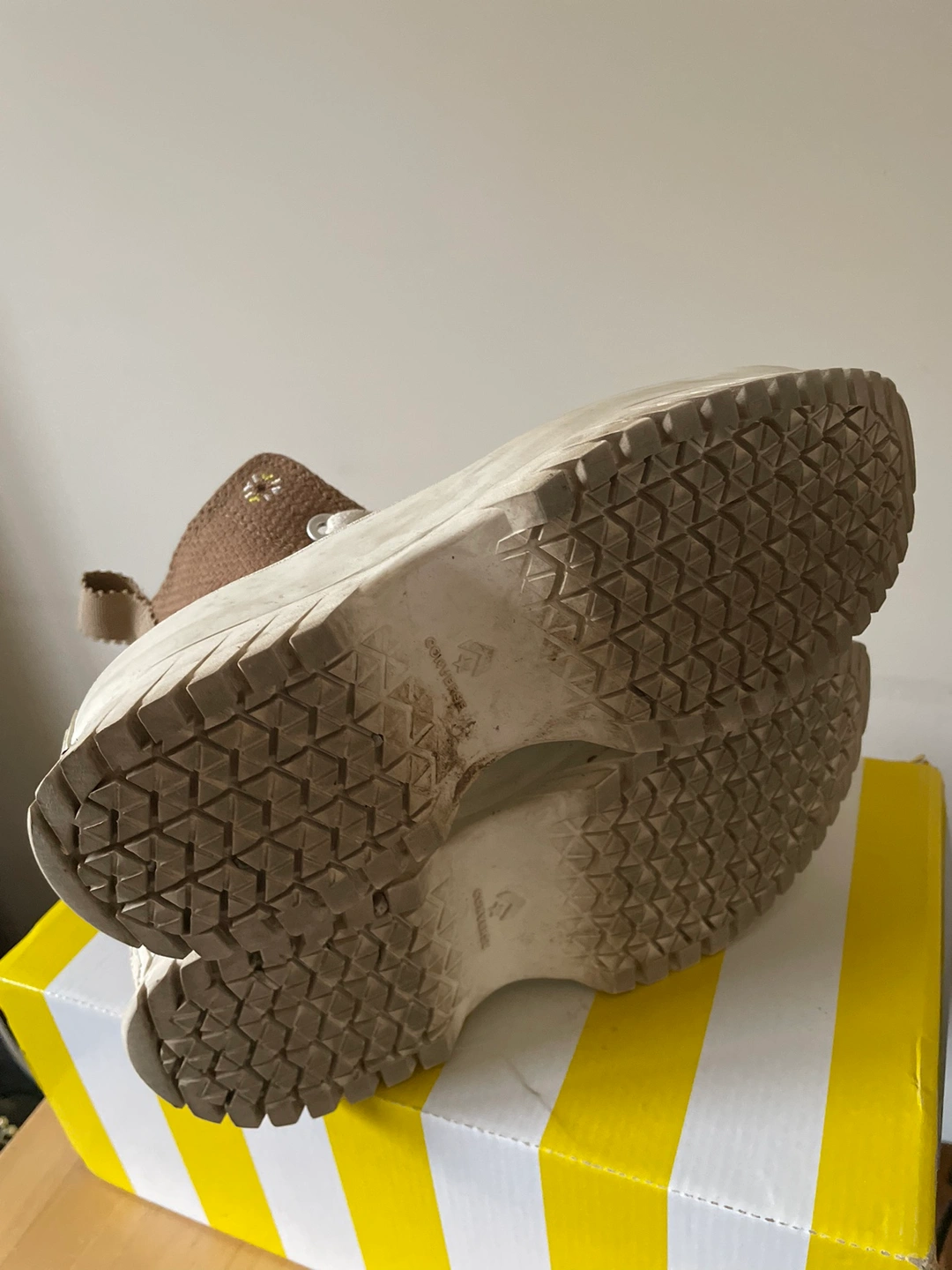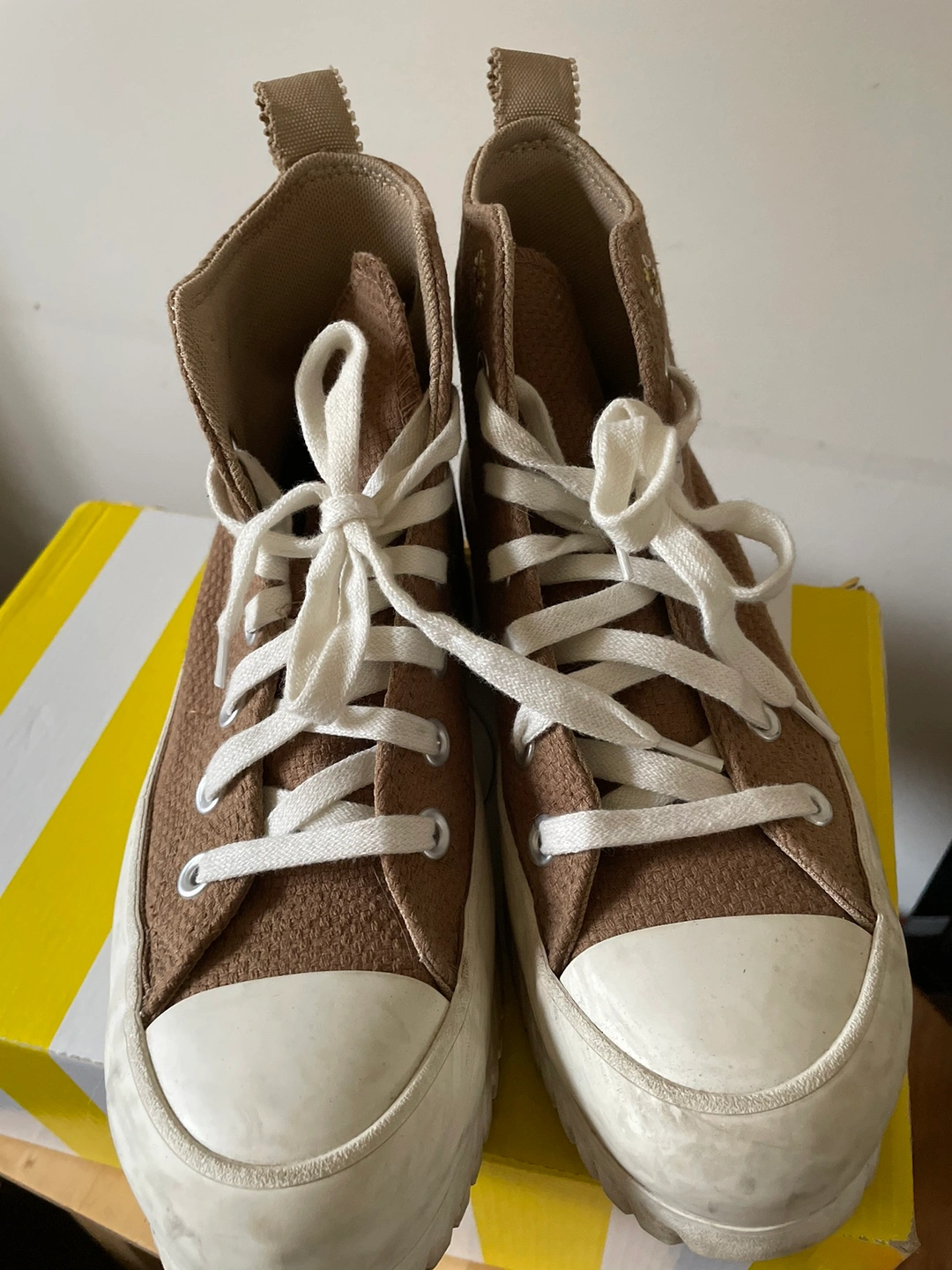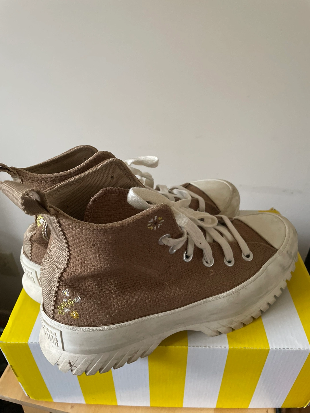 Brown high-top sneakers with white soles and flower embroidery. Size 4.5 Women's. Pick up at Don mills Steele east area. All sales are final
