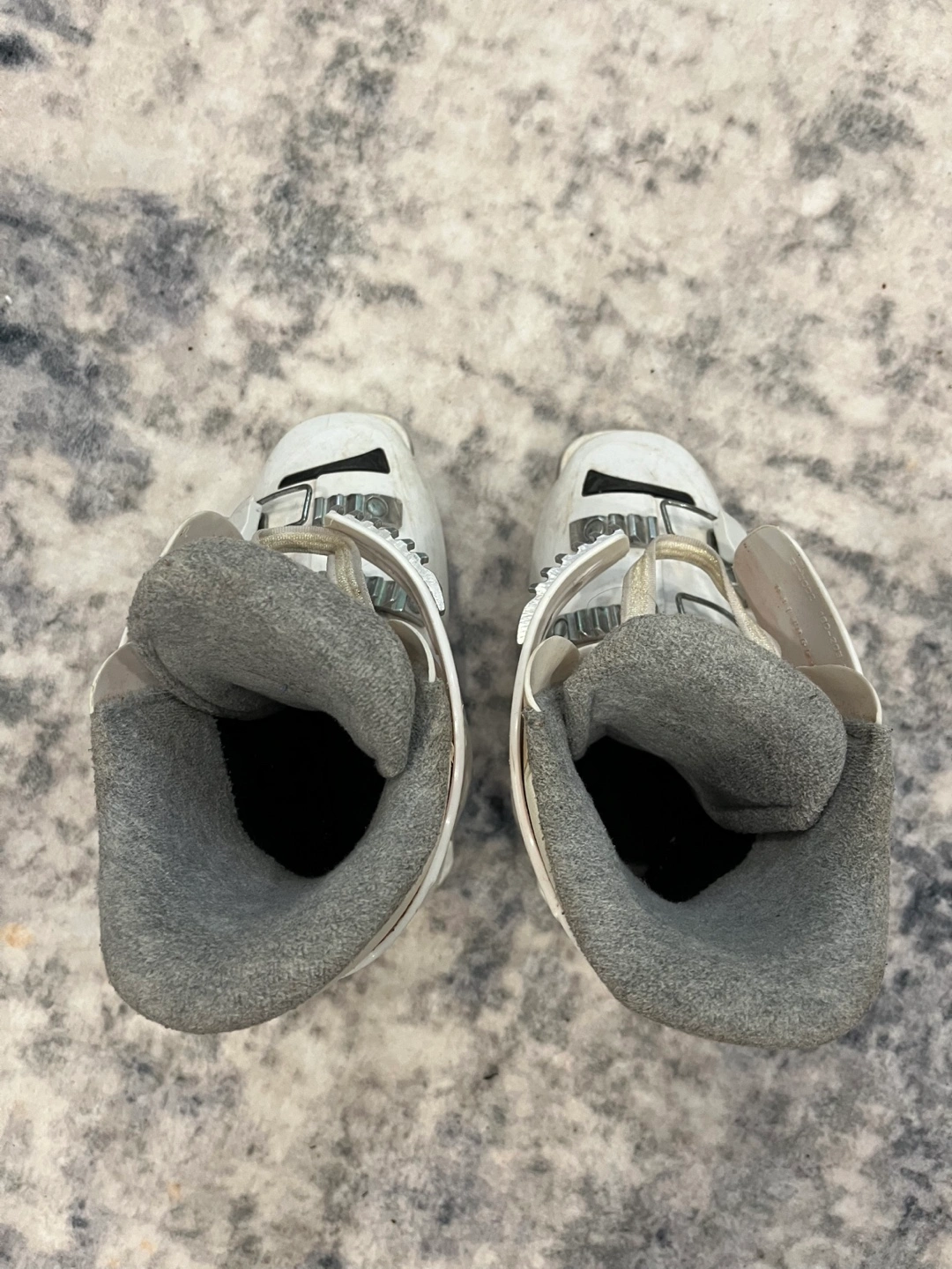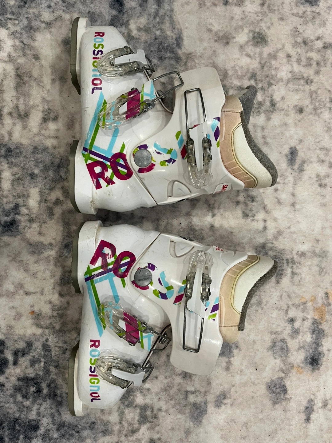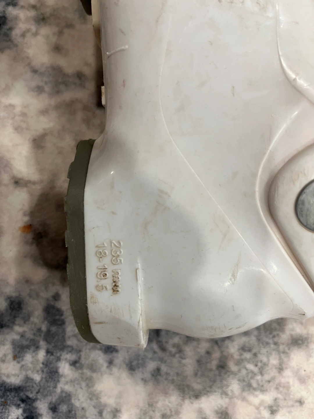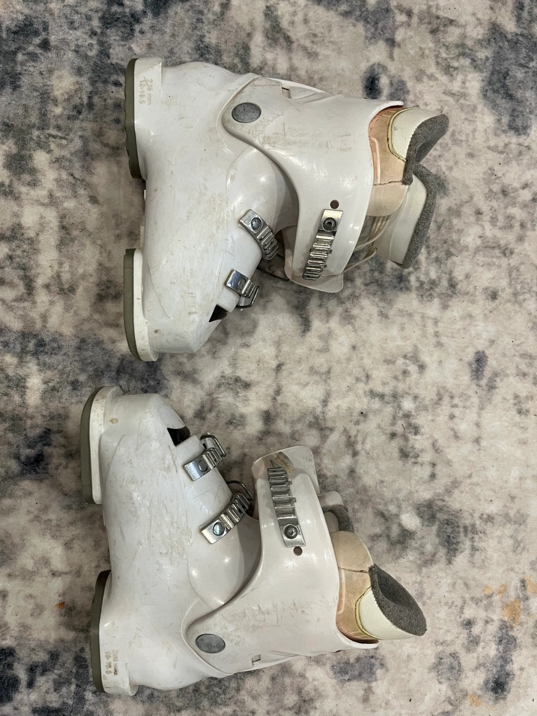 Priced to go! White ski boots with multicoloured detailing. Size 235mm 18-19.5 These ski boots still have a lot of life in them. Our girl has outgrown them. They’ll fit a 6-8 years old. Let’s find them a family that will use them this winter.